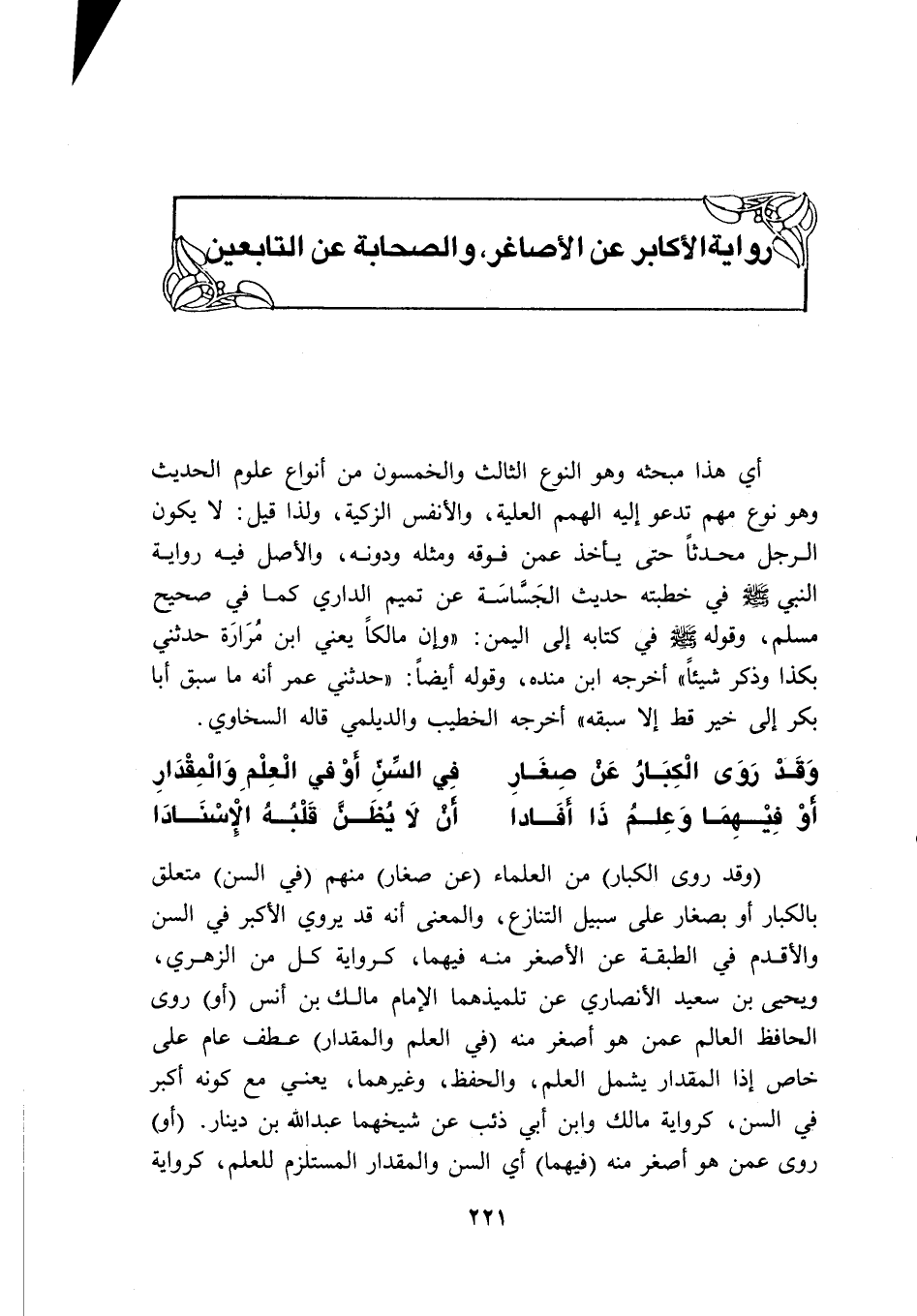 (وقد روى الكبار) من العلماء (عن صغار) منهم (في السن) متعلق بالكبار أو بصغار على سبيل التنازع، والمعنى أنه قد يروي الأكبر في السن والأقدم في الطبقة عن الأصغر منه فيهما، كرواية كل من الزهري، ويحيى بن سعيد الأنصاري عن تلميذهما الإمام مالك بن أنس (أو) روى الحافظ العالم عمن هو أصغر منه (في العلم والمقدار) عطف عام على خاص إذا المقدار يشمل العلم، والحفظ، وغيرهما، يعني مع كونه أكبر في السن، كرواية مالك وابن أبي ذئب عن شيخهما عبد الله بن دينار. (أو) روى عمن هو أصغر منه (فيهما) أي السن والمقدار المستلزم للعلم، كرواية