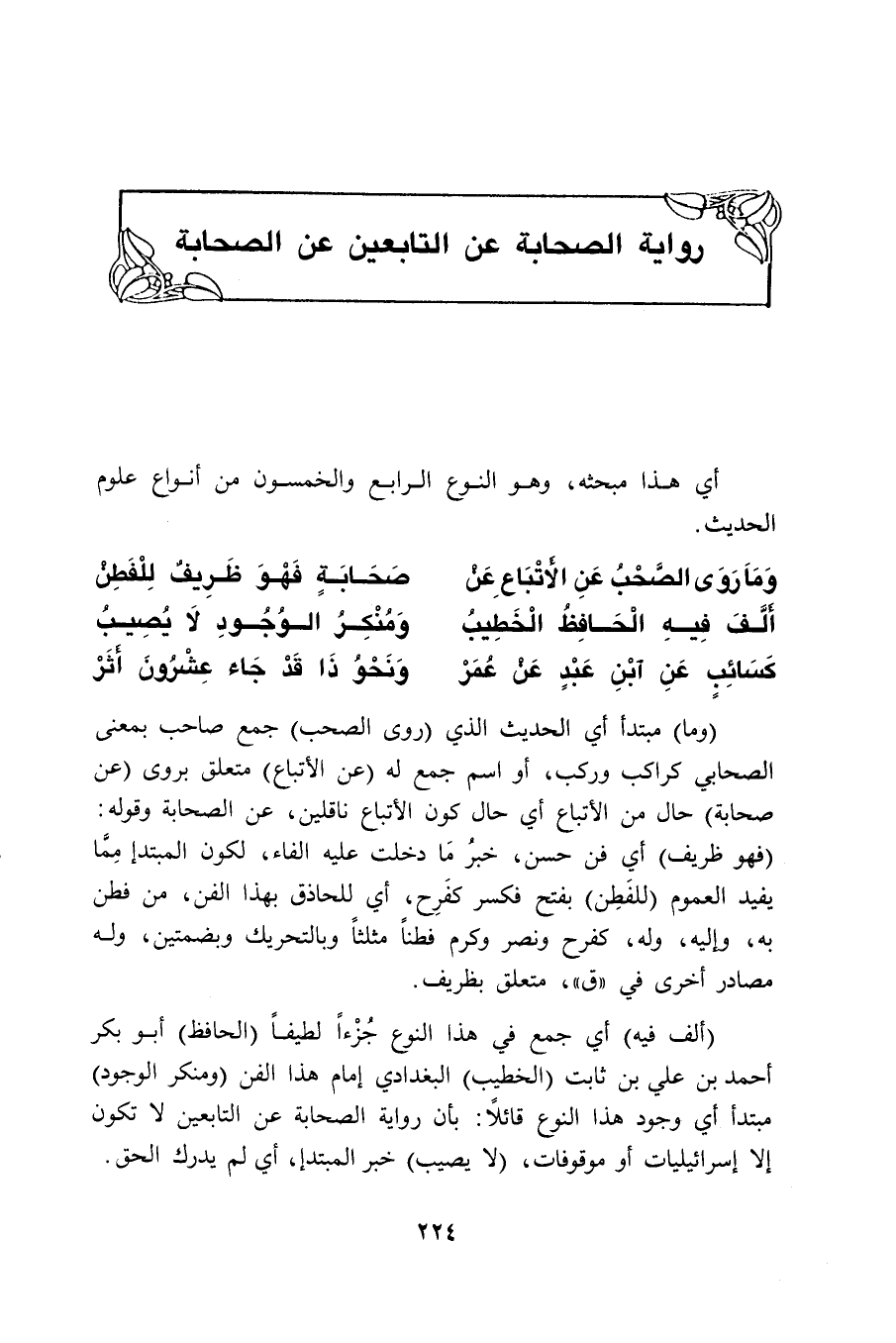 (وما) مبتدأ أي الحديث الذي (روى الصحب) جمع صاحب بمعنى الصحابي كراكب وركب، أو اسم جمع له (عن الأتباع) متعلق بروى (عن صحابة) حال من الأتباع أي حال كون الأتباع ناقلين، عن الصحابة وقوله: (فهو ظريف) أي فن حسن، خبرُ مَا دخلت عليه الفاء، لكون المبتدإ مِمَّا يفيد العموم (للفَطِن) بفتح فكسر كفَرِح، أي للحاذق بهذا الفن، من فطن به، وإليه، وله، كفرح ونصر وكرم فطناً مثلثاً وبالتحريك وبضمتين، وله مصادر أخرى في " ق "، متعلق بظريف.