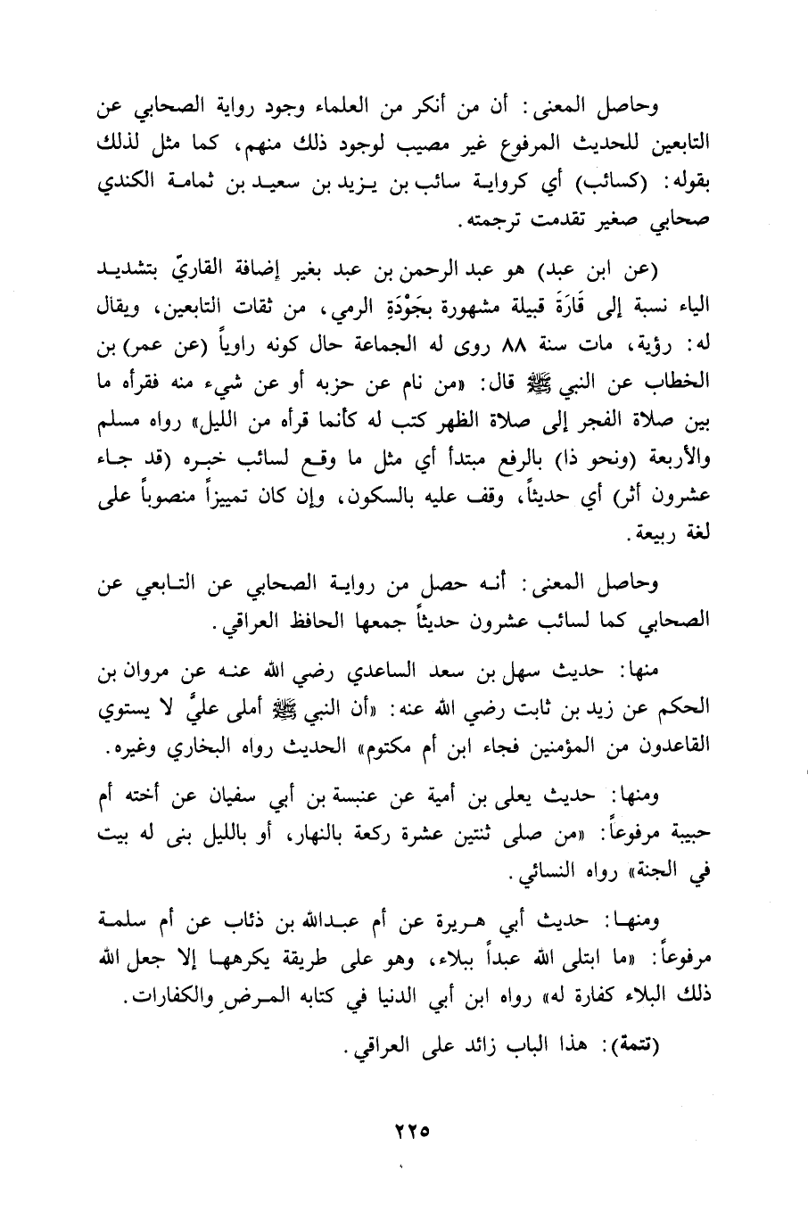 وحاصل المعنى: أنه حصل من رواية الصحابي عن التابعي عن الصحابى كما لسائب عشرون حديثاً جمعها الحافظ العراقي.