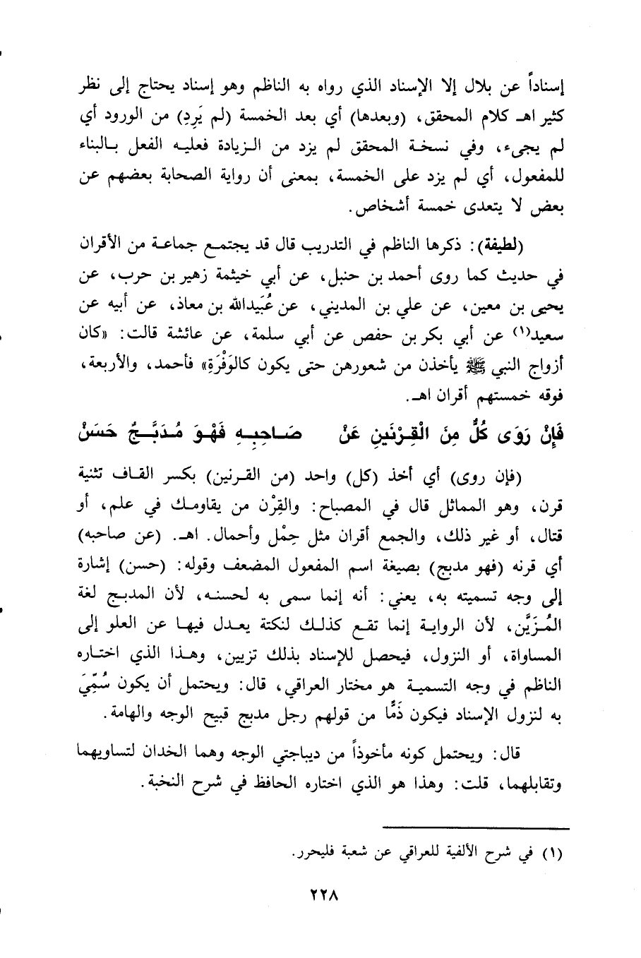 (لطيفة): ذكرها الناظم في التدريب قال قد يجتمع جماعة من الأقران في حديث كما روى أحمد بن حنبل، عن أبي خيثمة زهير بن حرب، عن يحيى بن معين، عن علي بن المديني، عن عُبَيد الله بن معاذ، عن أبيه عن سعيد (¬1) عن أبي بكر بن حفص عن أبي سلمة، عن عائشة قالت: " كان أزواج النبي - صلى الله عليه وسلم - يأخذن من شعورهن حتى يكون كالوَفْرَةِ " فأحمد، والأربعة، فوقه خمستهم أقران اهـ.