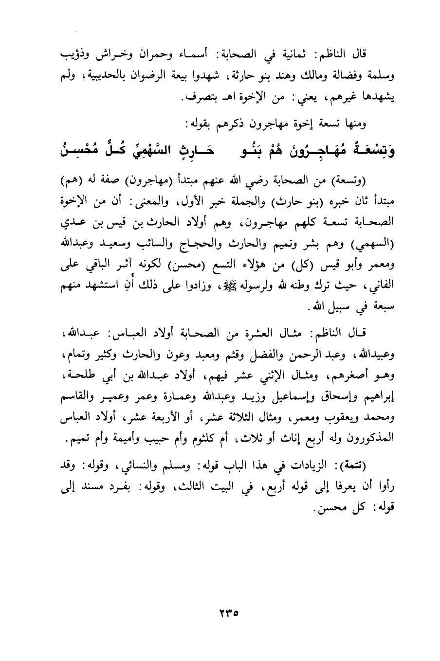 (وتسعة) من الصحابة - رضي الله عنهم - مبتدأ (مهاجرون) صفة له (هم) مبتدأ ثان خبره (بنو حارث) والجملة خبر الأول، والمعنى: أن من الإخوة الصحابة تسعة كلهم مهاجرون، وهم أولاد الحارث بن قيس بن عدي (السهمي) وهم بشر وتميم والحارث والحجاج والسائب وسعيد وعبد الله ومعمر وأبو قيس (كل) من هؤلاء التسع (محسن) لكونه آثر الباقي على الفاني، حيث ترك وطنه لله ولرسوله - صلى الله عليه وسلم -، وزادوا على ذلك أَنِ استشهد منهم سبعة في سبيل الله.