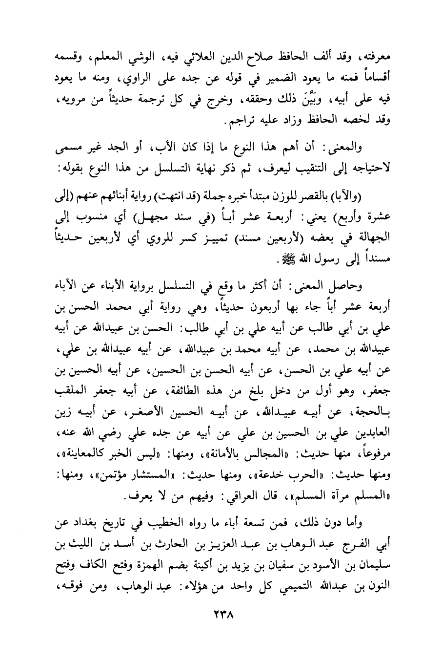 وحاصل المعنى: أن أكثر ما وقع في التسلسل برواية الأبناء عن الآباء أربعة عشر أباً جاء بها أربعون حديثاً، وهي رواية أبي محمد الحسن بن علي بن أبي طالب عن أبيه علي بن أبي طالب: الحسن بن عبيد الله عن أبيه عبيد الله بن محمد، عن أبيه محمد بن عبيد الله، عن أبيه عبيد الله بن علي، عن أبيه علي بن الحسن، عن أبيه الحسن بن الحسين، عن أبيه الحسين بن جعفر، وهو أول من دخل بلخ من هذه الطائفة، عن أبيه جعفر الملقب بالحجة، عن أبيه عبيد الله، عن أبيه الحسين الأصغر، عن أبيه زين العابدين علي بن الحسين بن علي عن أبيه عن جده علي - رضي الله عنه -، مرفوعاً، منها حديث: " المجالس بالأمانة "، ومنها: " ليس الخبر كالمعاينة "، ومنها حديث: " الحرب خدعة "، ومنها حديث: " المستشار مؤتمن "، ومنها: " المسلم مرآة المسلم ". قال العراقي: وفيهم من لا يعرف.