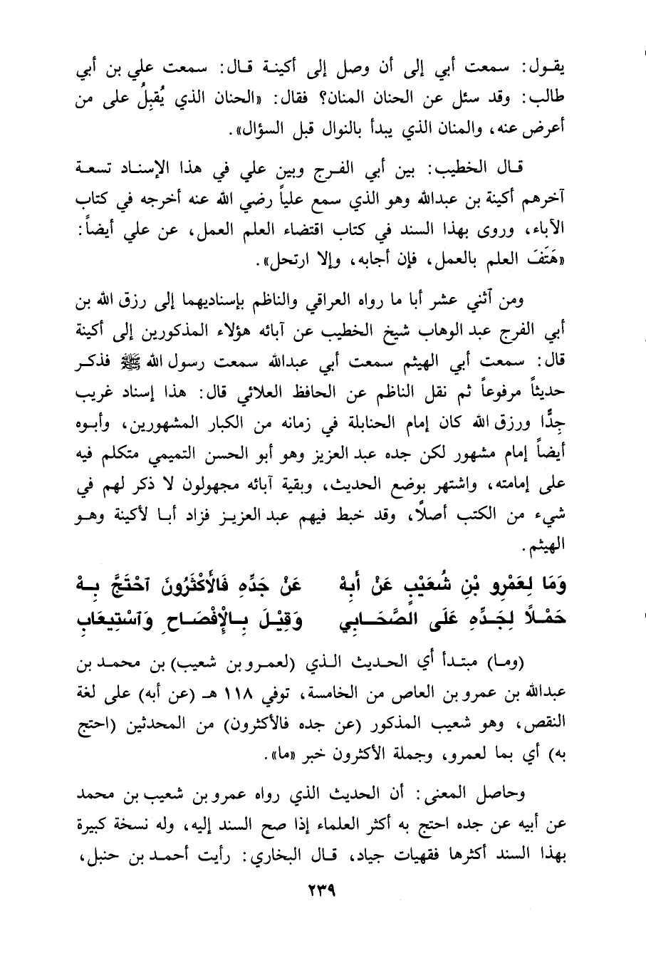 (وما) مبتدأ أي الحديث الذي (لعمرو بن شعيب) بن محمد بن عبد الله بن عمرو بن العاص من الخامسة، توفي 118 هـ (عن أبه) على لغة النقص، وهو شعيب المذكور (عن جده فالأكثرون) من المحدثين (احتج به) أي بما لعمرو، وجملة الأكثرون خبر " ما ".