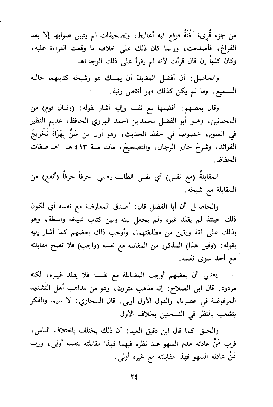 يعني أن بعضهم أوجب المقابلة مع نفسه فلا يقلد غيره، لكنه مردود. قال ابن الصلاح: إنه مذهب متروك، وهو من مذاهب أهل التشديد المرفوضة في عصرنا، والقول الأول أولى. قال السخاوي: لا سيما والفكر يتشعب بالنظر في النسختين بخلاف الأول.