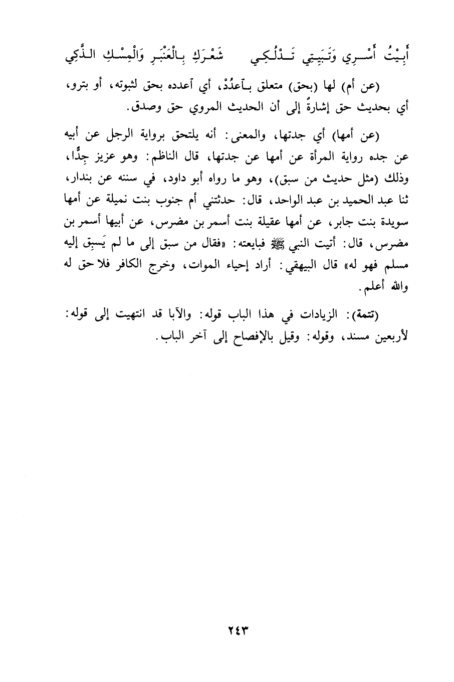(تَتِمَّة): الزيادات في هذا الباب قوله: والآبا قد انتهيت إلى قوله: لأربعين مسند، وقوله: وقيل بالإفصاح إلى آخر الباب.