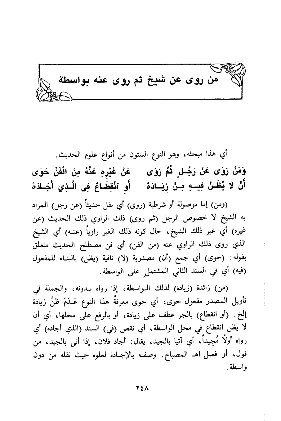 به الشيخ لا خصوص الرجل (ثم روى) ذلك الراوي ذلك الحديث (عن غيره) أي غير ذلك الشيخ، حال كونه ذلك الغير راوياً (عنه) أي الشيخ الذي روى ذلك الراوي عنه (من الفن) أي فن مصطلح الحديث متعلق بقوله: (حوى) أي جمع (أن) مصدرية (لا) نافية (يظن) بالبناء للمفعول (فيه) أي في السَّند الثاني المشتملِ على الواسطة.