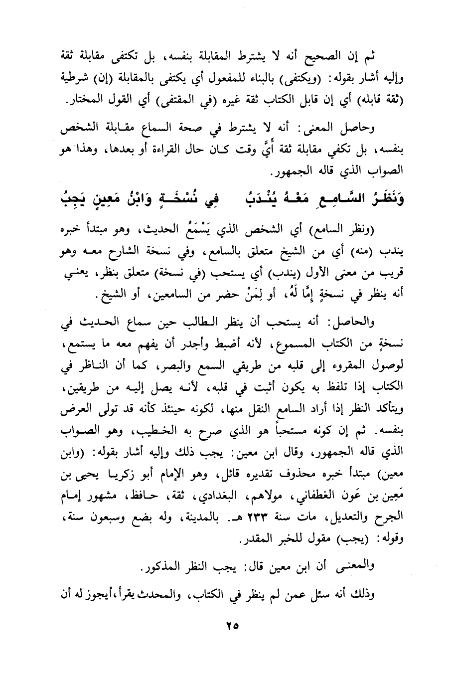 والحاصل: أنه يستحب أن ينظر الطالب حين سماع الحديث في نسخةٍ من الكتاب المسموع، لأنه أضبط وأجدر أن يفهم معه ما يستمع، لوصول المقروء إلى قلبه من طريقي السمع والبصر، كما أن الناظر في الكتاب إذا تلفظ به يكون أثبت في قلبه، لأنه يصل إليه من طريقين، ويتأكد النظر إذا أراد السامع النقل منها، لكونه حينئذ كأنه قد تولى العرض بنفسه. ثم إن كونه مستحباً هو الذي صرح به الخطيب، وهو الصواب الذي قاله الجمهور، وقال ابن معين: يجب ذلك وإليه أشار بقوله: (وابن معين) مبتدأ خبره محذوف تقديره قائل، وهو الإمام أبو زكريا يَحْيَى بن مَعِين بن عَون الغطفاني، مولاهم، البغدادي، ثقة، حافظ، مشهور إمام الجرح والتعديل، مات سنة 233 هـ. بالمدينة، وله بضع وسبعون سنة، وقوله: (يجب) مقول للخبر المقدر.