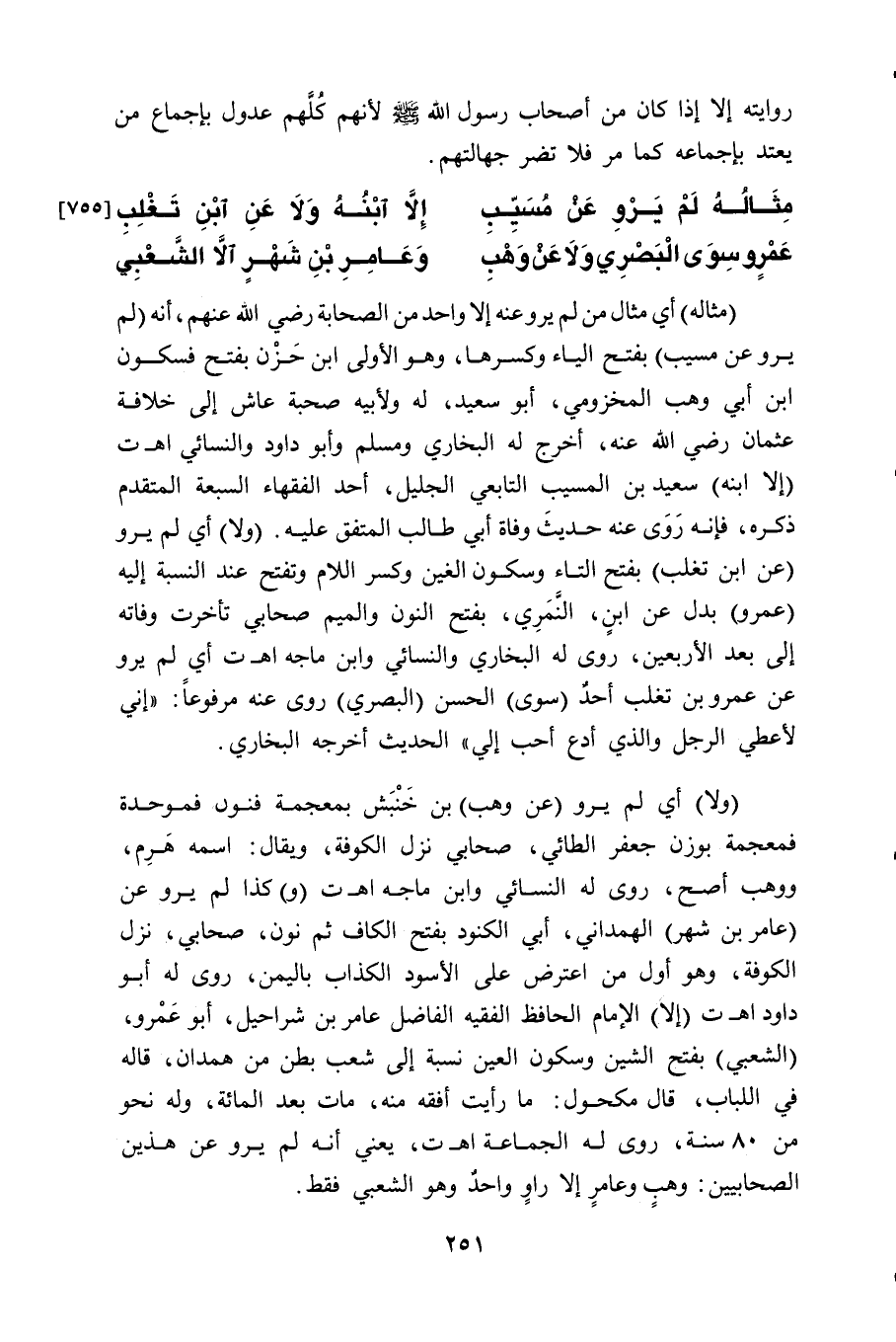 (مثاله) أي مثال من لم يرو عنه إلا واحد من الصحابة - رضي الله عنهم -، أنه (لَمْ يَرْوِ عَنْ مُسَيِّبِ) بفتح الياء وكسرها، وهو الأولى ابن حَزْن بفتح فسكون ابن أبي وهب المخزومي، أبو سعيد، له ولأبيه صحبة عاش إلى خلافة عثمان - رضي الله عنه -، أخرج له البخاري ومسلم وأبو داود والنسائي. اهـ ت. (إلا ابنه) سعيد بن المسيب التابعي الجليل، أحد الفقهاء السبعة المتقدم ذكره، فإنه رَوَى عنه حديثَ وفاة أبي طالب المتفق عليه. (ولا) أي لم يرو (عن ابن تغلب) بفتح التاء وسكون الغين وكسر اللام وتفتح عند النسبة إليه (عمرو) بدل عن ابنٍ، النَّمَرِي، بفتح النون والميم صحابي تأخرت وفاته إلى بعد الأربعين، روى له البخاري والنسائي وابن ماجه. اهـ ت أي لم يرو عن عمرو بن تغلب أحدٌ (سوى) الحسن (البصري) روى عنه مرفوعاً: " إني لأعطي الرجل والذي أدع أحب إلي " الحديث أخرجه البخاري.