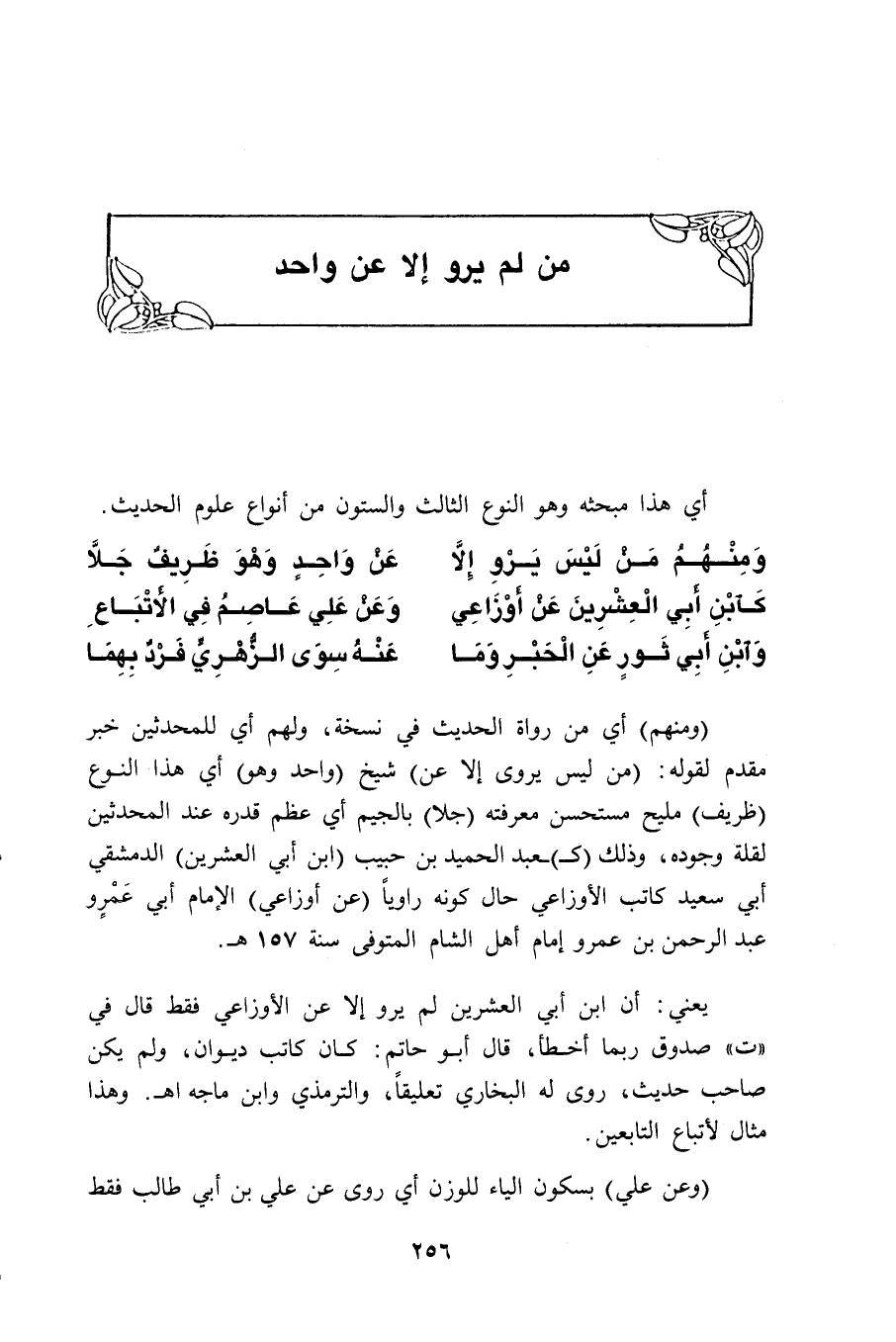 (ومنهم) أي من رواة الحديث في نسخة، ولهم أي للمحدثين خبر مقدم لقوله: (من ليس يروى إلا عن) شيخ (واحد وهو) أي هذا النوع (ظريف) مليح مستحسن معرفته (جَلاَّ) بالجيم أي عظم قدره عند المحدثين لقلة وجوده، وذلك (كـ) ـعبد الحميد بن حبيب (ابن أبي العشرين) الدمشقي أبي سعيد كاتب الأوزاعي حال كونه راوياً (عن أوزاعي) الإمام أبي عمرو عبد الرحمن بن عمرو إمام أهل الشام المتوفى سنة 157 هـ.