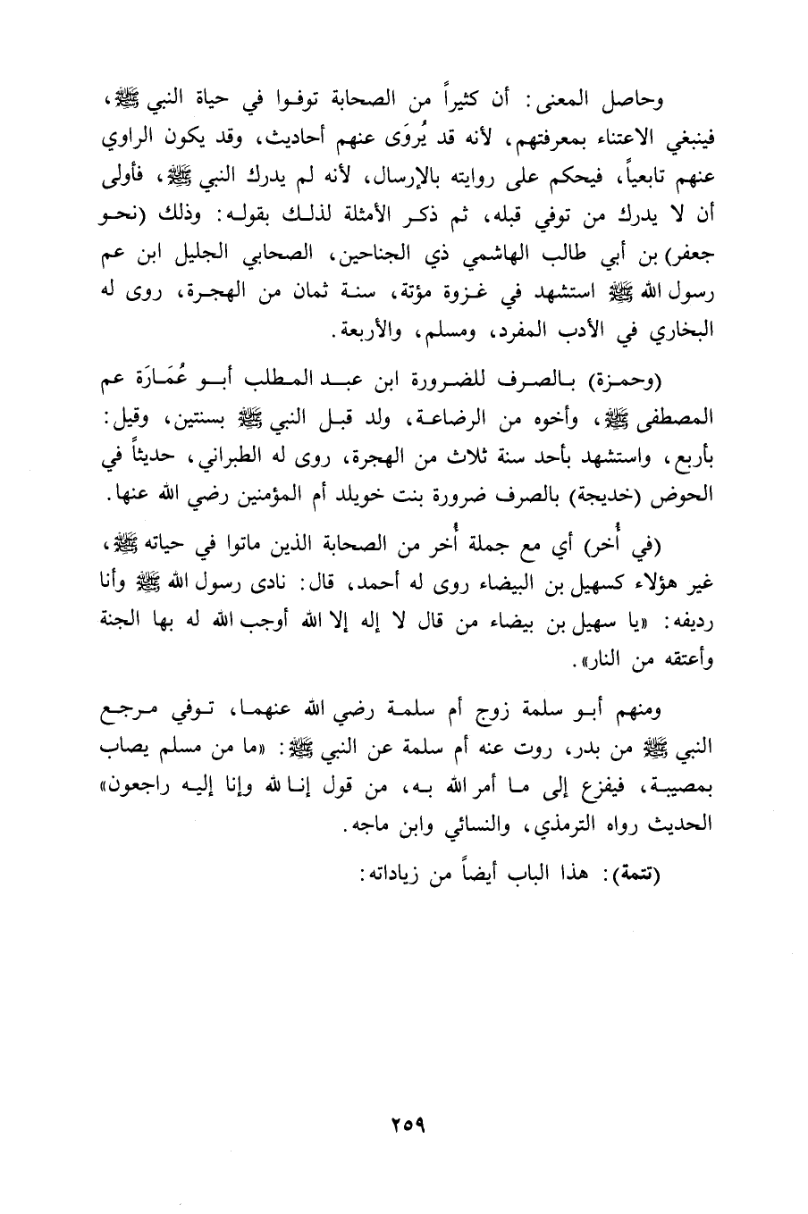 وحاصل المعنى: أن كثيراً من الصحابة توفوا في حياة النبي - صلى الله عليه وسلم - فينبغي الاعتناء بمعرفتهم، لأنه قد يُروَى عنهم أحاديث، وقد يكون الراوي عنهم تابعياً، فيحكم على روايته بالإرسال، لأنه لم يدرك النبي - صلى الله عليه وسلم -، فأولى أن لا يدرك من توفي قبله، ثم ذكر الأمثلة لذلك بقوله: وذلك (نحو جعفر) بن أبي طالب الهاشمي ذي الجناحين، الصحابي الجليل ابن عم رسول الله - صلى الله عليه وسلم - استشهد في غزوة مؤتة، سنة ثمان من الهجرة، روى له البخاري في الأدب المفرد، ومسلم، والأربعة.