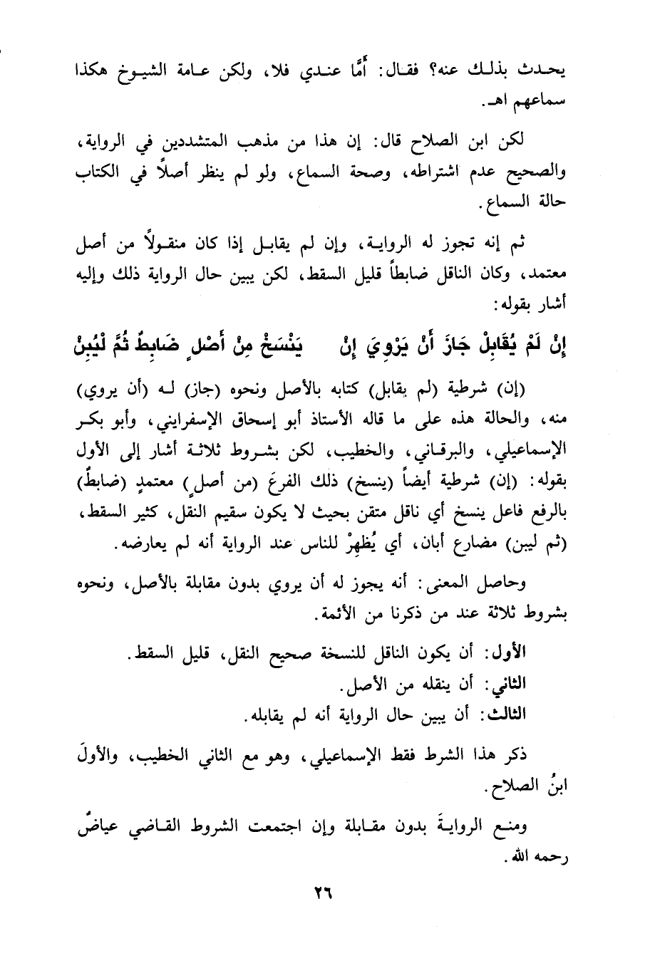 ومنع الروايةَ بدون مقابلة وإن اجتمعت الشروط القاضي عياضٌ رحمه الله.