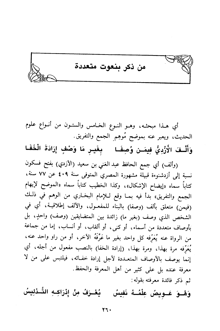 (وألف) أي جمع الحافظ عبد الغني بن سعيد (الأزدي) بفتح فسكون نسبة إلى أزدشنوءة قبيلة مشهورة المصري المتوفى سنة 409 عن 77 سنة، كتاباً سماه " إيضاح الإشكال "، وكذا الخطيب كتاباً سماه " الموضح لإيهام الجمع والتفريق " بدأ فيه بما وقع للإمام البخاري من الوهم في ذلك (فيمن) متعلق بألف (وصفا) بالبناء للمفعول، والألف إطلاقية، أي في الشخص الذي وصف (بغير ما) زائدة بين المتضايقين (وصف) واحدٍ، بل بأوصاف متعددة من أسماء، أو كنى، أو ألقاب، أو أنساب، إما من جماعة من الرواة عنه يُعَرِّفه كل واحد بغير ما عَرَّفَهُ الآخر، أو من راو واحد عنه، يُعَرِّفه مرة بهذا، ومرة بهذا، (إرادة الخفا) بالنصب مفعول من أجله، أي إنما يوصف بالأوصاف المتعددة لأجل إرادة خافائه، فيلتبس على من لا معوفة عنده بل على كثير من أهل المعرفة والحفظ.