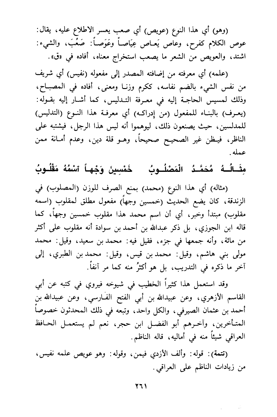 (مثاله) أي هذا النوع (محمد) بمنع الصرف للوزن (المصلوب) في الزندقة، كان يضع الحديث (خمسين وجهاً) مفعول مطلق لمقلوب (اسمه مقلوب) مبتدأ وخبر، أي أن اسم محمد هذا مقلوب خمسين وجهاً، كما قاله ابن الجوزي، بل ذكر عبد الله بن أحمد بن سوادة أنه مقلوب على أكثر من مائة، وأنه جمعها في جزء، فقيل فيه: محمد بن سعيد، وقيل: محمد مولى بني هاشم، وقيل: محمد بن قيس، وقيل: محمد بن الطبري، إلى آخر ما ذكره في التدريب، بل هو أكثرُ منه كما مر آنفاً.