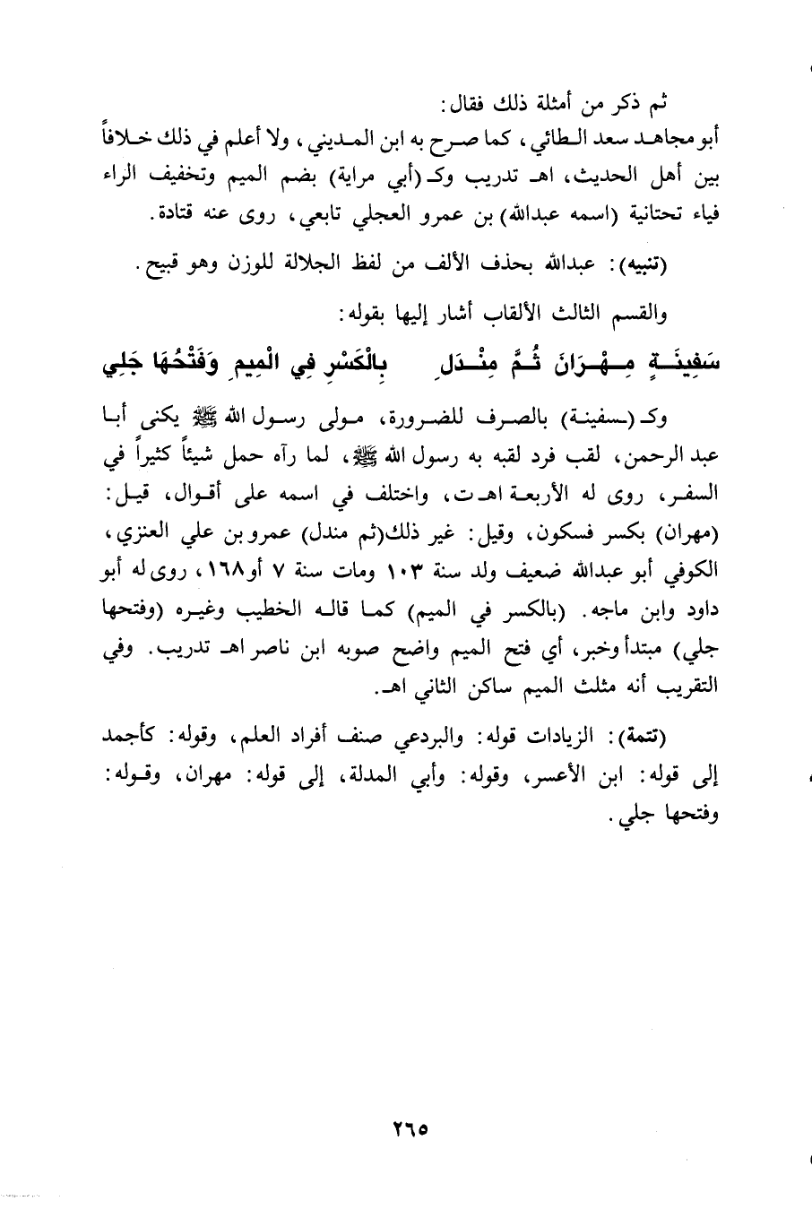 وكـ (ـسفينة) بالصرف للضرورة، مولى رسول الله - صلى الله عليه وسلم - يكنى أبا عبد الرحمن، لقب فرد لقبه به رسول الله - صلى الله عليه وسلم -، لما رآه حمل شيئاً كثيراً في السفر، روى له الأربعة. اهـ ت. واختلف في اسمه على أقوال، قيل: (مهران) بكسر فسكون، وقيل: غير ذلك (ثم مندل) عمرو بن علي العنزي، الكوفي أبو عبد الله ضعيف ولد سنة 103 ومات سنة 7 أو 168، روى له أبو داود وابن ماجه. (بالكسر في الميم) كما قاله الخطيب وغيره (وفتحها جلي) مبتدأ وخبر، أي فتح الميم واضح صوبه ابن ناصر. اهـ تدريب. وفي التقريب أنه مثلث الميم ساكن الثاني اهـ.