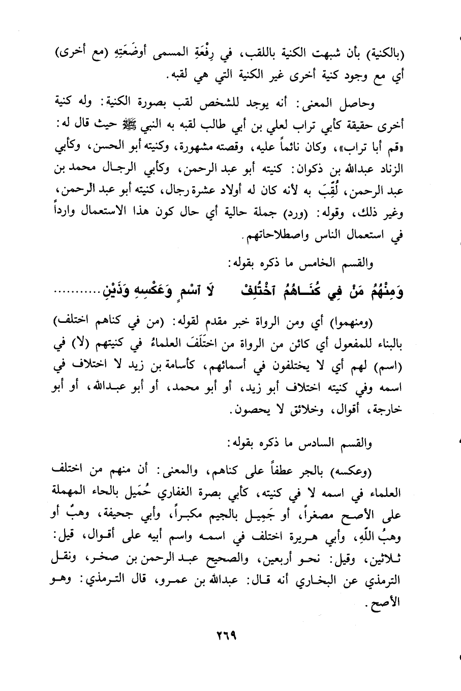(ومنهموا) أي ومن الرواة خبر مقدم لقوله: (من في كناهم اختلف) بالبناء للمفعول أي كائن من الرواة من اختَلَفَ العلماءُ في كنيتهم (لا) في (اسم) لهم أي لا يختلفون في أسمائهم، كأسامة بن زيد لا اختلاف في اسمه وفي كنيته اختلاف أبو زيد، أو أبو محمد، أو أبو عبد الله، أو أبو خارجة، أقوال، وخلائق لا يحصون.
