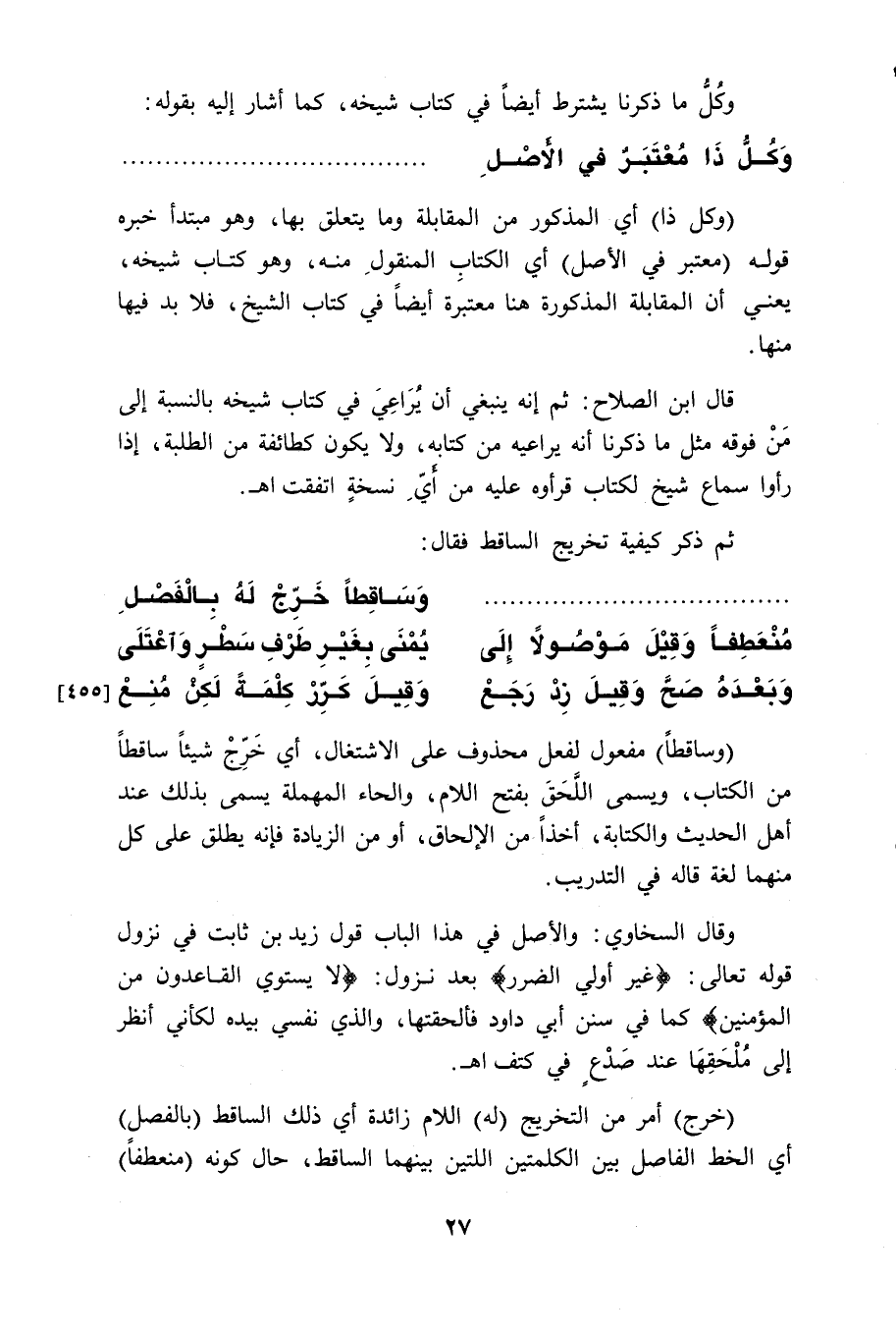 (وساقطاً) مفعول لفعل محذوف على الاشتغال، أي خَرِّجْ شيئاً ساقطاً من الكتاب، ويُسَمَّى اللَّحَقَ بفتح اللام، والحاء المهملة يسمى بذلك عند أهل الحديث والكتابة، أخذاً من الإلحاق، أو من الزيادة فإنه يطلق على كل منهما لغة قاله في التدريب.