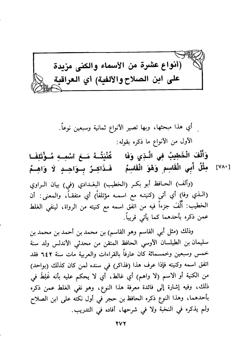 (أنواع عشرة من الأسماء والكنى مزيدة على ابن الصلاح والألفية) أي العراقية