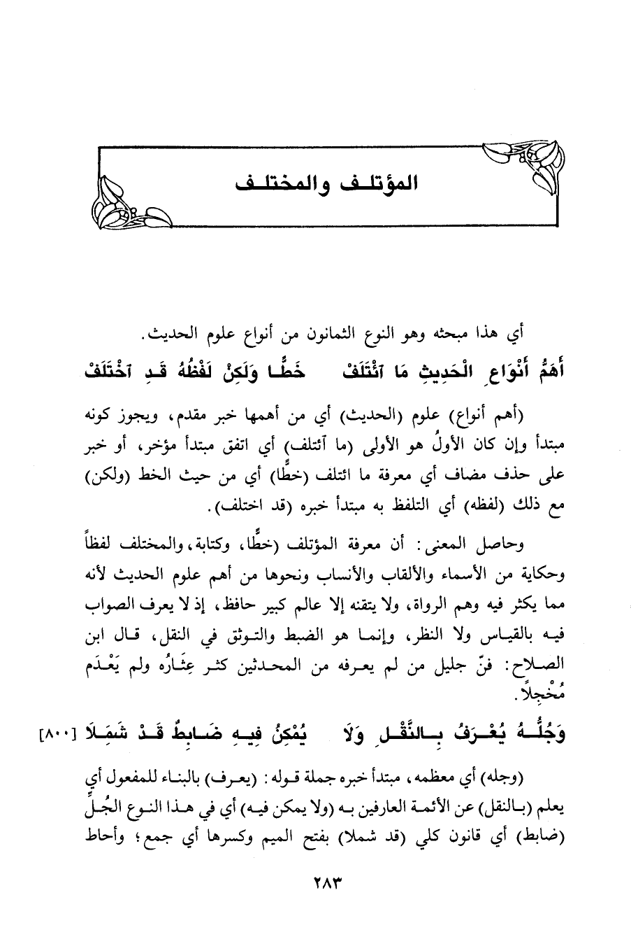 وحاصل المعنى: أن معرفة المؤتلف (خطًّا، وكتابة، والمختلف لفظاً وحكاية من الأسماء والألقاب والأنساب ونحوها من أهم علوم الحديث لأنه مما يكثر فيه وهم الرواة، ولا يتقنه إلا عالم كبير حافظ، إذ لا يعرف الصواب فيه بالقياس ولا النظر، وإنما هو الضبط والتوثق في النقل، قال ابن الصلاح: فنّ جليل من لم يعرفه من المحدثين كثر عِثَارُه ولم يَعْدَم مُخْجِلاً.