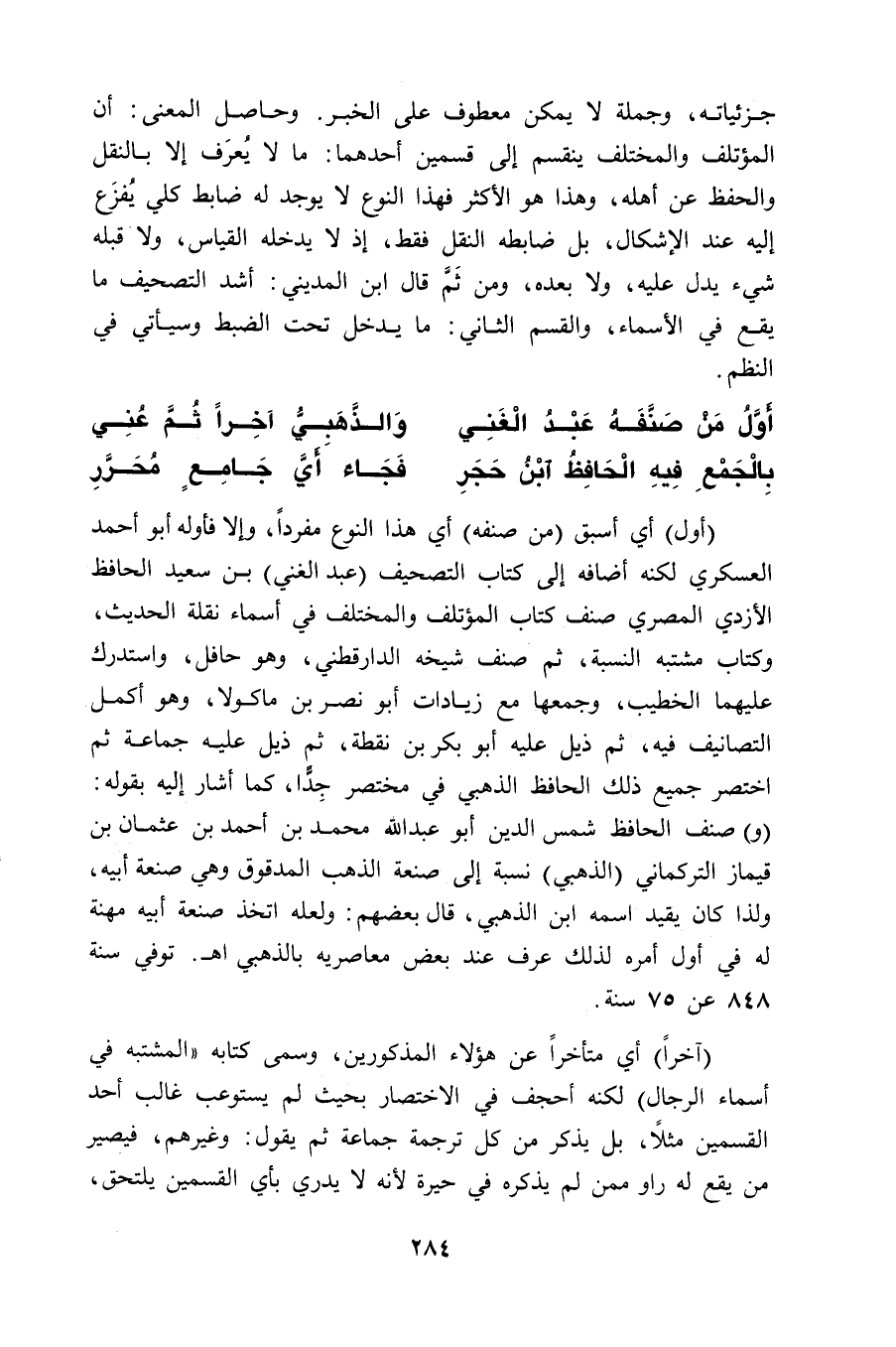 (أول) أي أسبق (من صنفه) أي هذا النوع مفرداً، وإلا فأوله أبو أحمد العسكري لكنه أضافه إلى كتاب التصحيف (عبد الغني) بن سعيد الحافظ الأزدي المصري صنف كتاب المؤتلف والمختلف في أسماء نقلة الحديث، وكتاب مشتبه النسبة، ثم صنف شيخه الدارقطني، وهو حافل، واستدرك عليهما الخطيب، وجمعها مع زيادات أبو نصر بن ماكولا، وهو أكمل التصانيف فيه، ثم ذيل عليه أبو بكر بن نقطة، ثم ذيل عليه جماعة ثم اختصر جميع ذلك الحافظ الذهبي في مختصر جِدًّا، كما أشار إليه بقوله: (و) صنف الحافظ شمس الدين أبو عبد الله محمد بن أحمد بن عثمان بن قيماز التركماني (الذهبي) نسبة إلى صنعة الذهب المدقوق وهي صنعة أبيه، ولذا كان يقيد اسمه ابن الذهبي، قال بعضهم: ولعله اتخذ صنعة أبيه مهنة له في أول أمره لذلك عرف عند بعض معاصريه بالذهبي اهـ. توفي سنة 848 عن 75 سنة.