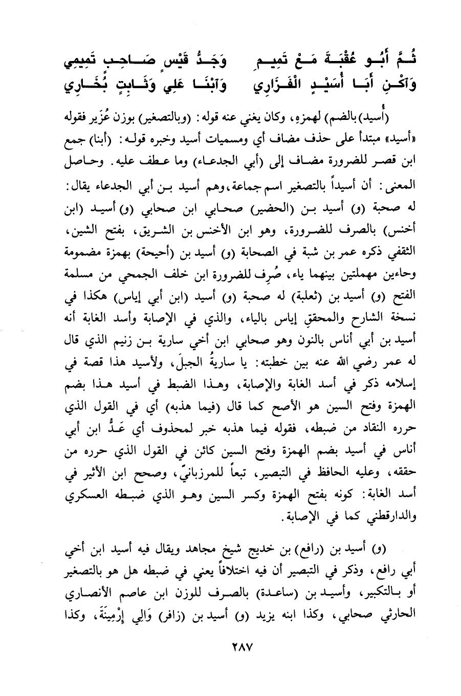 (و) أسيد بن (رافع) بن خديج شيخ مجاهد ويقال فيه أسيد ابن أخي أبي رافع، وذكر في التبصير أن فيه اختلافاً يعني في ضبطه هل هو بالتصغير أو بالتكبير، وأسيد بن (ساعدة) بالصرف للوزن ابن عاصم الأنصاري الحارثي صحابي، وكذا ابنه يزيد (و) أسيد بن (زافر) وَالِي إِرْمِينَةَ، وكذا