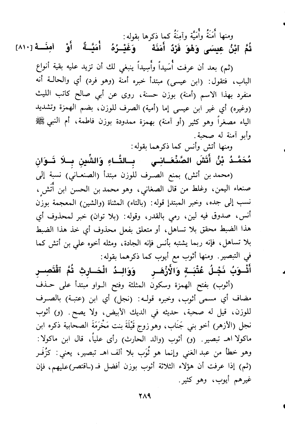 (ثم) بعد أن عرفت أُسَيداً وأَسِيداً ينبغي لك أن تزيد عليه بقية أنواع الباب، فتقول: (ابن عيسى) مبتدأ خبره أمنة (وهو فرد) أي والحالة أنه منفرد بهذا الاسم (أمنة) بوزن حسنة، روى عن أبي صالح كاتب الليث (وغيره) أي غير ابن عيسى إما (أمية) الصرف للوزن، بضم الهمزة وتشديد الياء مصغراً وهو كثير (أو آمنة) بهمزة ممدودة بوزن فاطمة، أم النبي - صلى الله عليه وسلم - وأبو آمنة له صحبة.