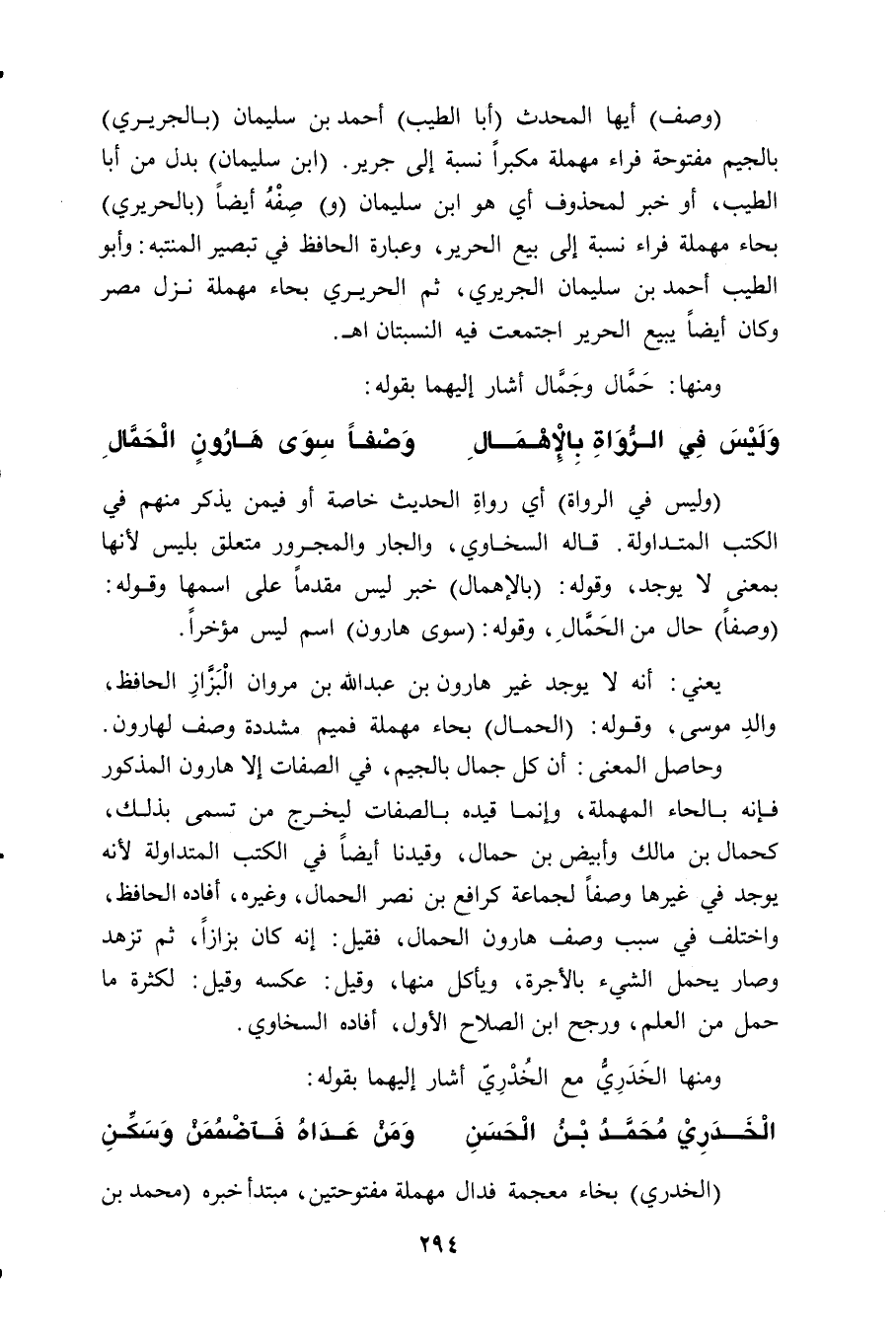 فإنه بالحاء المهملة، وإنما قيده بالصفات ليخرج من تسمى بذلك، كحمال بن مالك وأبيض بن حمال، وقيدنا أيضاً في الكتب المتداولة لأنه يوجد في غيرها وصفاً لجماعة كرافع بن نصر الحمال، وغيره، أفاده الحافظ، واختلف في سبب وصف هارون الحمال، فقيل: إنه كان بزازاً، ثم تزهد وصار يحمل الشيء بالأجرة، ويأكل منها، وقيل: عكسه وقيل: لكثرة ما حمل من الحلم، ورجح ابن الصلاح الأول، أفاده السخاوي.