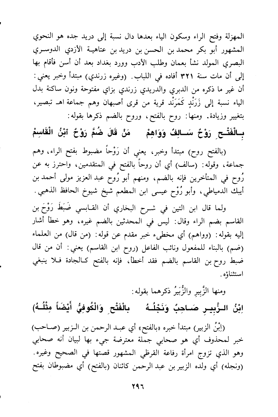 المهزلة وفتح الراء وسكون الياء بعدها دال نسبة إلى دريد جده هو النحوي المشهور أبو بكر محمد بن الحسن بن دريد بن عتاهية الأزدي الدوسري البصري المولد نشأ بعمان وطلب الأدب وورد بغداد بعد أن أسن فأقام بها إلى أن مات سنة 321 أفاده في اللباب. (وغيره زرندي) مبتدأ وخبر يعني: أن غير ما ذكره من الدبري والدريدي زرندي بزاي مفتوحة ونون ساكنة بدل الياء نسبة إلى زَرَنْدٍ كَمَرَنْد قرية من قرى أصبهان وهم جماعة. اهـ تبصير، بتغيير وزيادة. ومنها: روح بالفتح، وروح بالضم ذكرها بقوله:
