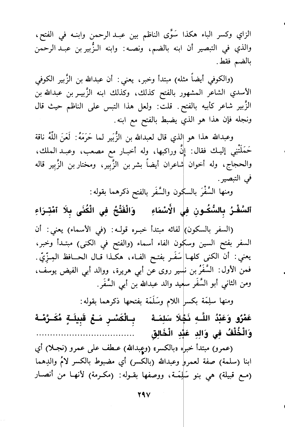 الزاي وكسر الباء هكذا سَوّى الناظم بين عبد الرحمن وابنه في الفتح، والذي في التبصير أن ابنه بالضم، ونصه: وابنه الزُّبير بن عبد الرحمن بالضم فقط.