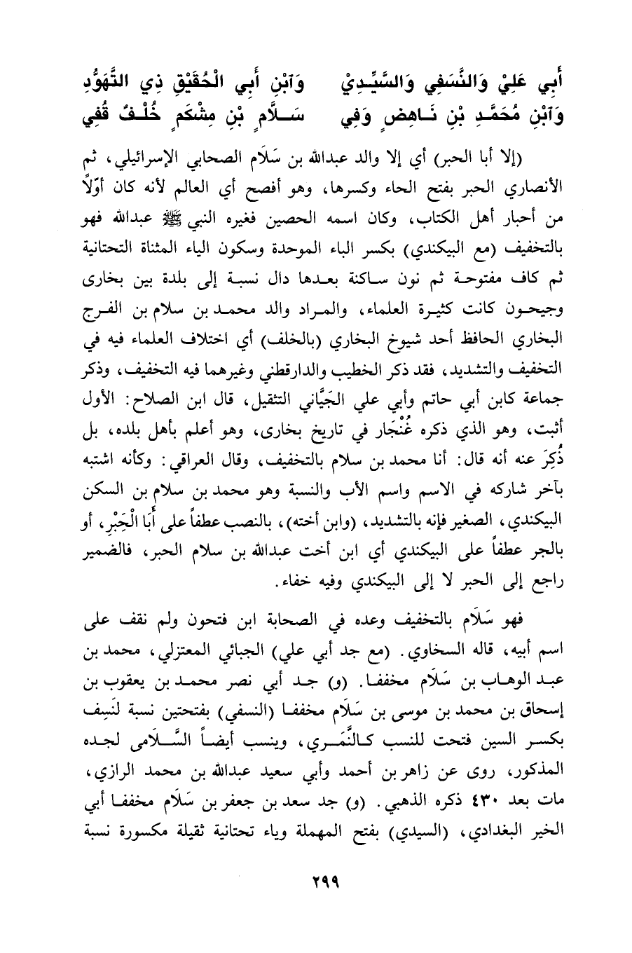 فهو سَلاَم بالتخفيف وعده في الصحابة ابن فتحون ولم نقف على اسم أبيه، قاله السخاوي. (مع جد أبي علي) الجبائي المعتزلي، محمد بن عبد الوهاب بن سَلَام مخففا. (و) جد أبي نصر محمد بن يعقوب بن إسحاق بن محمد بن موسى بن سَلَام مخففا (النسفي) بفتحتين نسبة لنَسِف بكسر السين فتحت للنسب كالنَّمَري، وينسب أيضاً السَّلَامي لجده المذكور، روى عن زاهر بن أحمد وأبي سعيد عبد الله بن محمد الرازي، مات بعد 430 ذكره الذهبي. (و) جد سعد بن جعفر بن سَلَام مخففا أبي الخير البغدادي، (السيدي) بفتح المهملة وياء تحتانية ثقيلة مكسورة نسبة