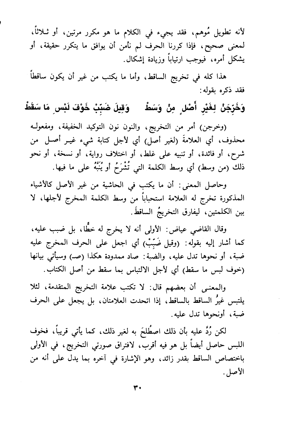 وقال القاضي عياض: الأولى أنه لا يخرج له خطًّا، بل ضبب عليه، كما أشار إليه بقوله: (وقيل ضَبِّبْ) أي اجعل على الحرف المخرج عليه ضبة، أو نحوها تدل عليه، والضبة: صاد ممدودة هكذا (صـ) وسيأتي بيانها (خوف لبس ما سقط) أي لأجل الالتباس بما سقط من أصل الكتاب.