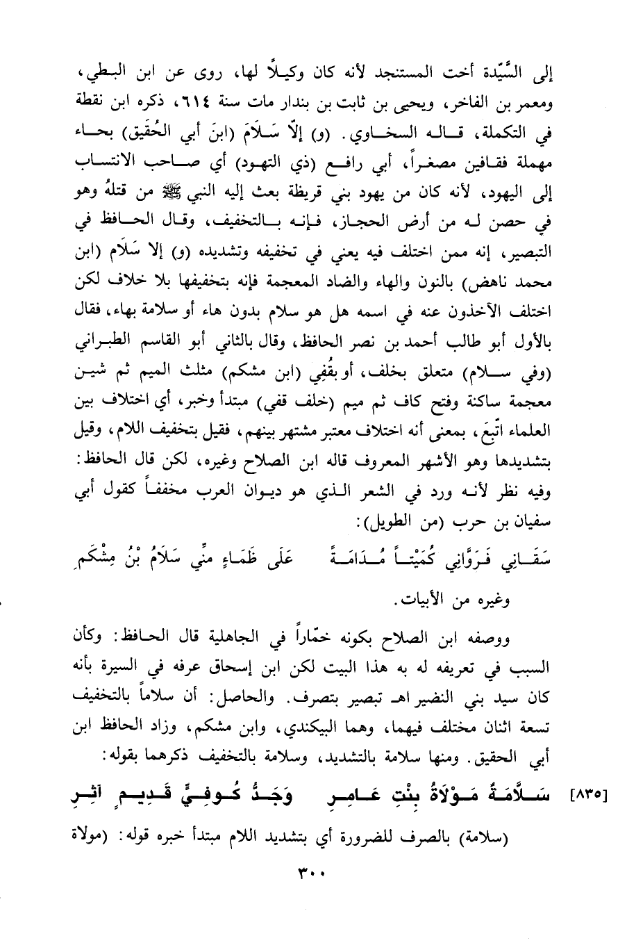 ووصفه ابن الصلاح بكونه خمَّاراً في الجاهلية قال الحافظ: وكأن السبب في تعريفه له به هذا البيت لكن ابن إسحاق عرفه في السيرة بأنه كان سيد بني النضير. اهـ تبصير بتصرف. والحاصل: أن سلاماً بالتخفيف تسعة اثنان مختلف فيهما، وهما البيكندي، وابن مشكم، وزاد الحافظ ابن أبي الحقيق. ومنها سلامة بالتشديد، وسلامة بالتخفيف ذكرهما بقوله: