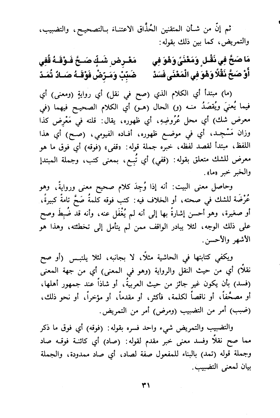 وحاصل معنى البيت: أنه إذا وُجِدَ كلام صحيح معنى وروايةً، وهو عُرْضَة للشك في صحته، أو الخلاف فيه: كتب فوقه كلمةُ صَحَّ تامةً كبيرةً، أو صغيرة، وهو أحسن إشارةً بها إلى أنه لم يُغْفَل عنه، وأنه قد ضُبِطَ وصح على ذلك الوجه، لئلا يبادر الواقف ممن لم يتأمل إلى تخطئته، وهذا هو الأشهر والأحسن.