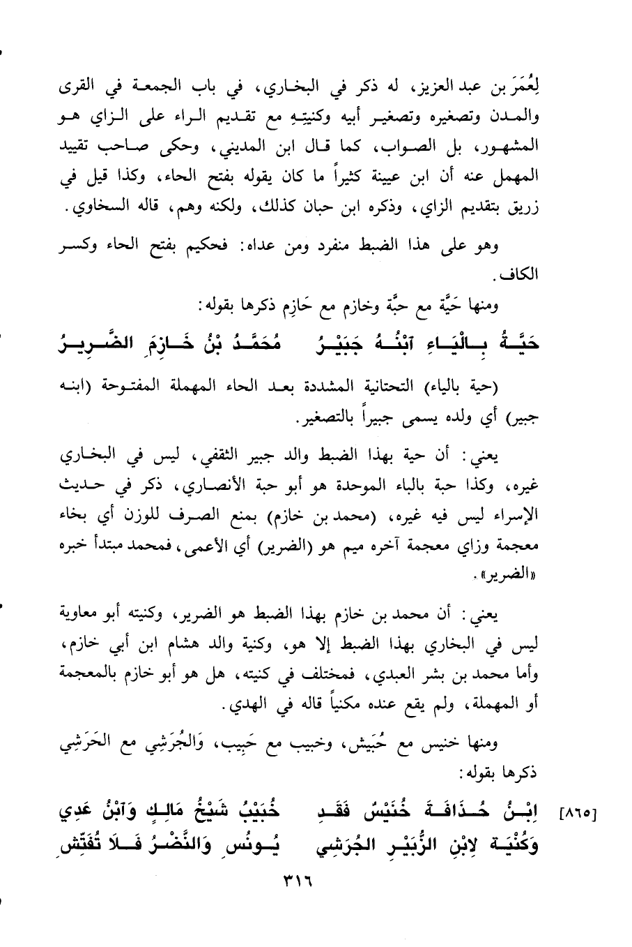 يعني: أن حية بهذا الضبط والد جبير الثقفي، ليس في البخاري غيره، وكذا حبة بالباء الموحدة هو أبو حبة الأنصاري، ذكر في حديث الإسراء ليس فيه غيره، (محمد بن خازم) بمنع الصرف للوزن أي بخاء معجمة وزاي معجمة آخره ميم هو (الضرير) أي الأعمى، فمحمد مبتدأ خبره " الضرير ".