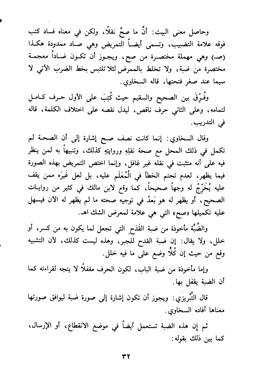 وقال السخاوي: إنما كانت نصف صح إشارة إلى أن الصحة لم تكمل في ذلك المحل مع صحة نقلِهِ وروايتِهِ كذلك، وتنبيهاً به لمن ينظر فيه على أنه متثبت في نقله غير غافل، وإنما اختص التمريض بهذه الصورة فيما يظهر، لعدم تحتم الخطأ في الْمُعَلَم عليه، بل لعل غَيرَه ممن يقف عليه يُخَرِّجُ له وجهاً صحيحاً، كما وقع لابن مالك في كثير من روايات الصَّحِيح، أو يظهر له هو بَعدُ في توجيه صحته ما لم يظهر له الآن فيسهل عليه تكميلها " صح " التي هي علامة لمعرض الشك اهـ.