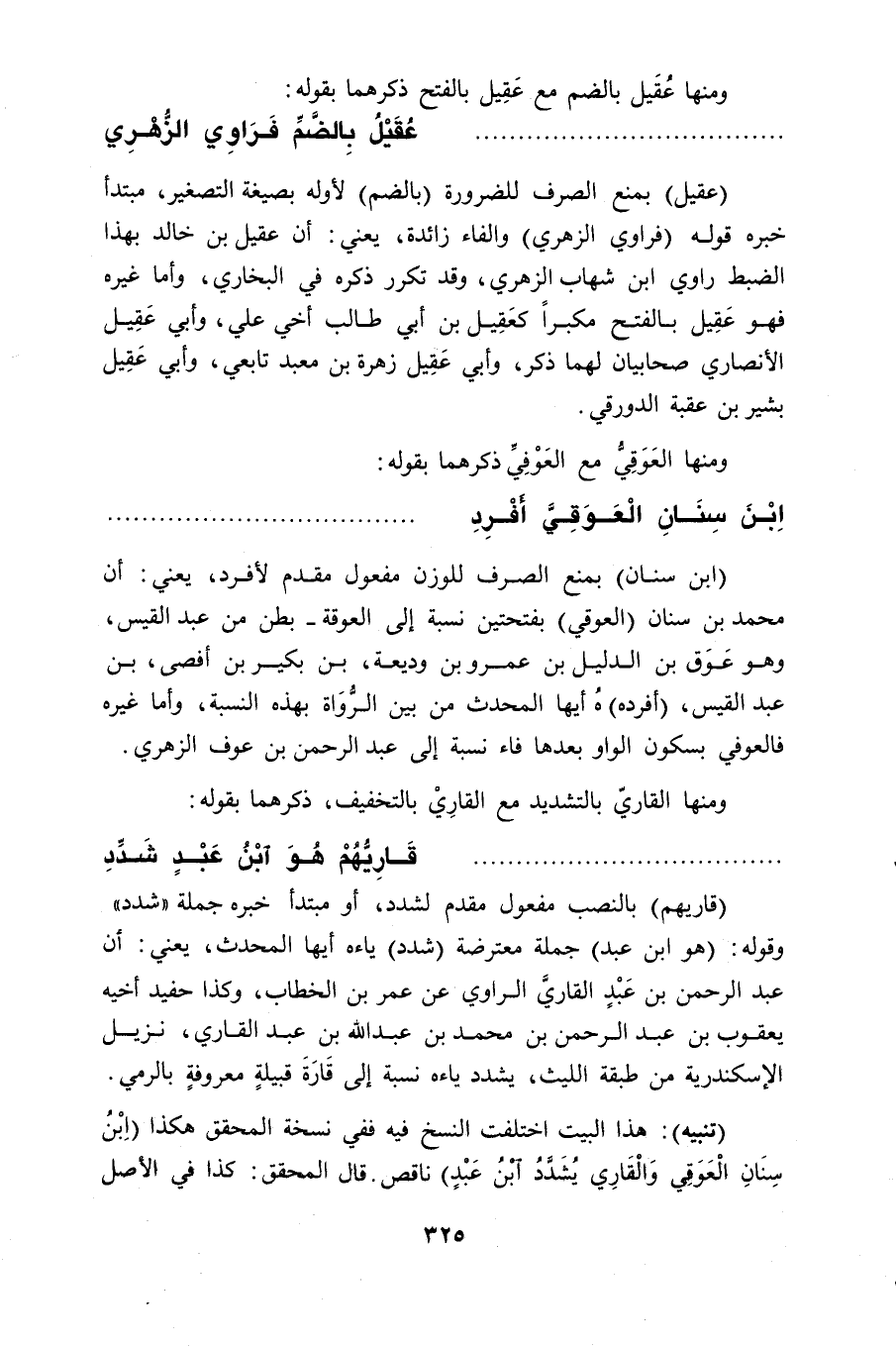 (تنبيه): هذا البيت اختلفت النسخ فيه ففي نسخة المحقق هكذا (اِبْنُ سِنَانِ العَوَقِي وَالقَارِي يُشَدَّدُ ابنُ عَبْدٍ) ناقص. قال المحقق: كذا في الأصل