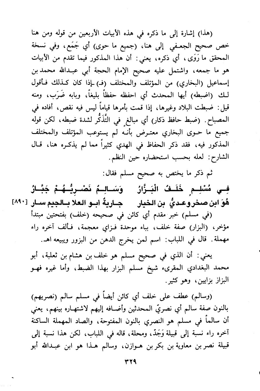 (هذا) إشارة إلى ما ذكره في هذه الأبيات الأربعين من قوله ومن هنا خص صحيح الجعفي إلى هنا، (جميع ما حوى) أي جَمَع، وفي نسخة المحقق ما رَوَى، أي ذكره، يعني: أن هذا المذكور فيما تقدم من الأبيات هو ما جمعه، واشتمل عليه صحيح الإمام الحجة أبي عبد الله محمد بن إسماعيل (البخاري) من المؤتلف والمختلف (فـ) ـإذا كان كذلك فأقول لك (اضبطه) أيها المحدث أي احفظه حفظاً بليغاً، وبابه ضَرَب، ومنه قيل: ضبطت البلاد وغيرها، إذا قمت بأمرها قياماً ليس فيه نقص، أفاده في المصباح. (ضبط حافظ ذكار) أي مبالغٍ في التَذَكُّر لشدة ضبطه، لكن قوله جميع ما حوى البخاري معترض بأنه لم يستوعب المؤتلف والمختلف المذكور فيه، فقد ذكر الحفاظ في الهدي كثيراً مما لم يذكره هنا، قال الشارح: لعله بحسب استحضاره حين النظم.