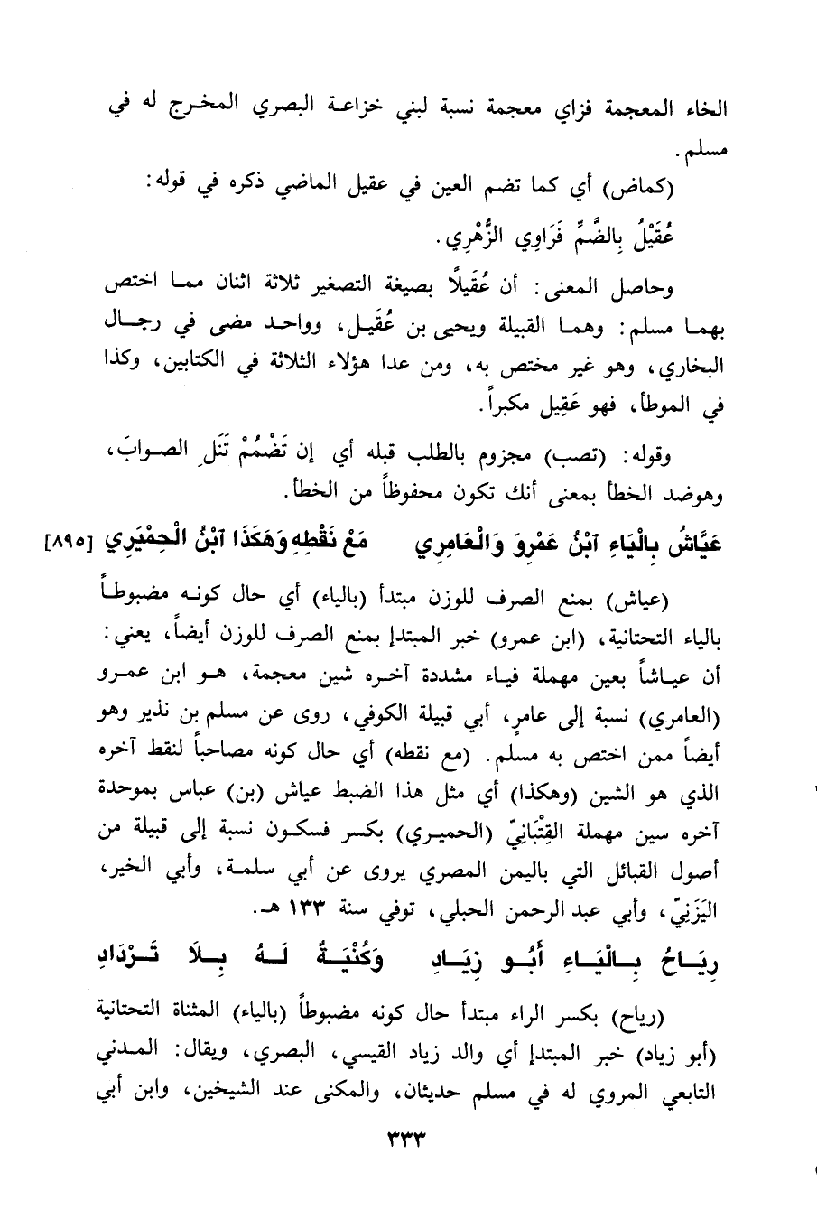 (عياش) بمنع الصرف للوزن مبتدأ (بالياء) أي حال كونه مضبوطاً بالياء التحتانية، (ابن عمرو) خبر المبتدإ بمنع الصرف للوزن أيضاً، يعني: أن عياشاً بعين مهملة فياء مشددة آخره شين معجمة، هو ابن عمرو (العامري) نسبة إلى عامرٍ، أبي قبيلة الكوفي، روى عن مسلم بن نذير وهو أيضاً ممن اختص به مسلم. (مع نقطه) أي حال كونه مصاحباً لنقط آخره الذي هو الشين (وهكذا) أي مثل هذا الضبط عياش (بن) عباس بموحدة آخره سين مهملة القِتْبَانِيّ (الحميري) بكسر فسكون نسبة إلى قبيلة من أصول القبائل التي باليمن المصري يروى عن أبي سلمة، وأبي الخير، اليَزَنِيّ، وأبي عبد الرحمن الحبلي، توفي سنة 133 هـ.