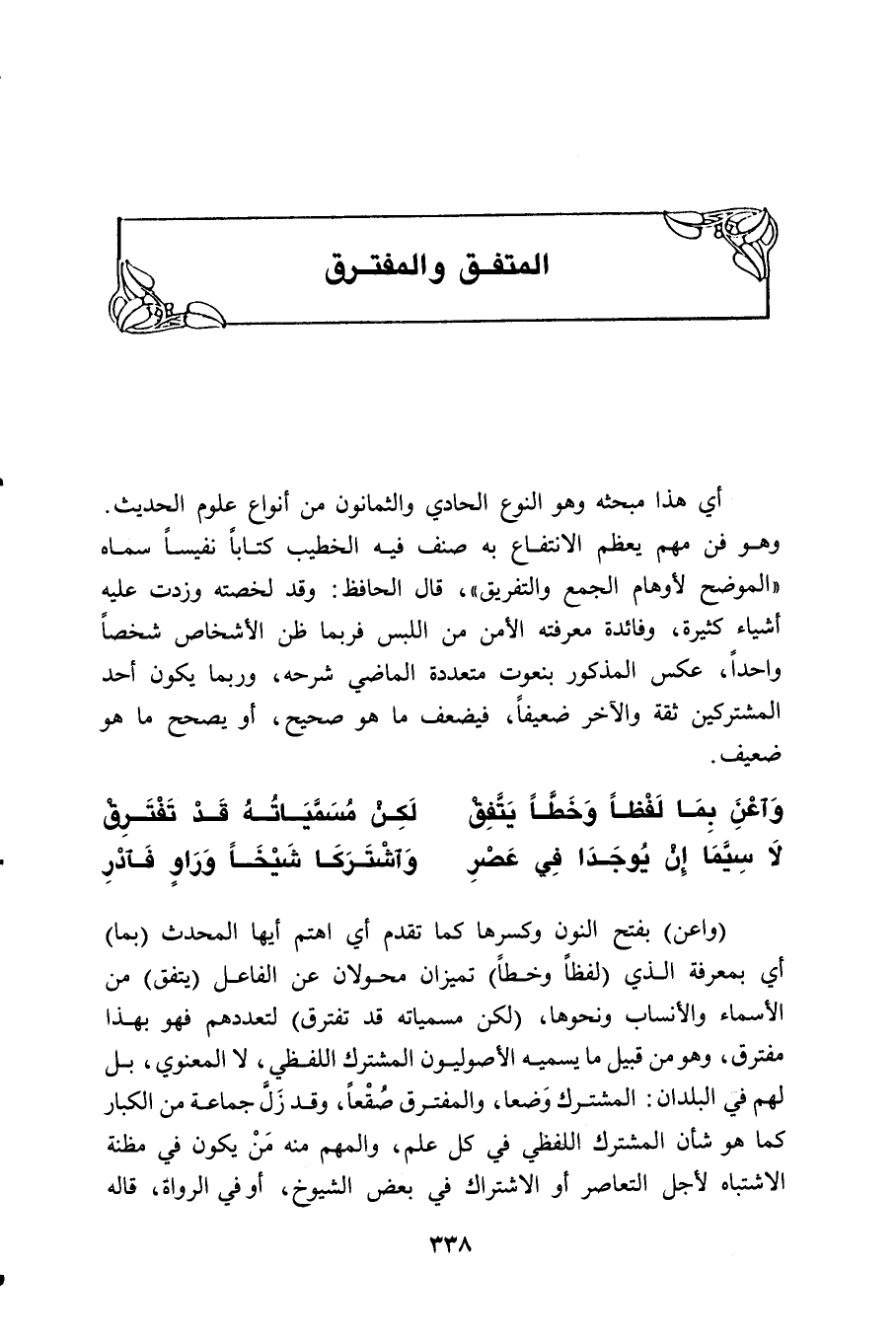 وهو فن مهم يعظم الانتفاع به صنف فيه الخطيب كتاباً نفيساً سماه " الموضح لأوهام الجمع والتفريق ". قال الحافظ: وقد لخصته وزدت عليه أشياء كثيرة، وفائدة معرفته الأمن من اللبس فربما ظن الأشخاص شخصاً واحداً، عكس المذكور بنعوت متعددة الماضي شرحه، وربما يكون أحد المشتركين ثقة والآخر ضعيفاً، فيضعف ما هو صحيح، أو يصحح ما هو ضعيف.