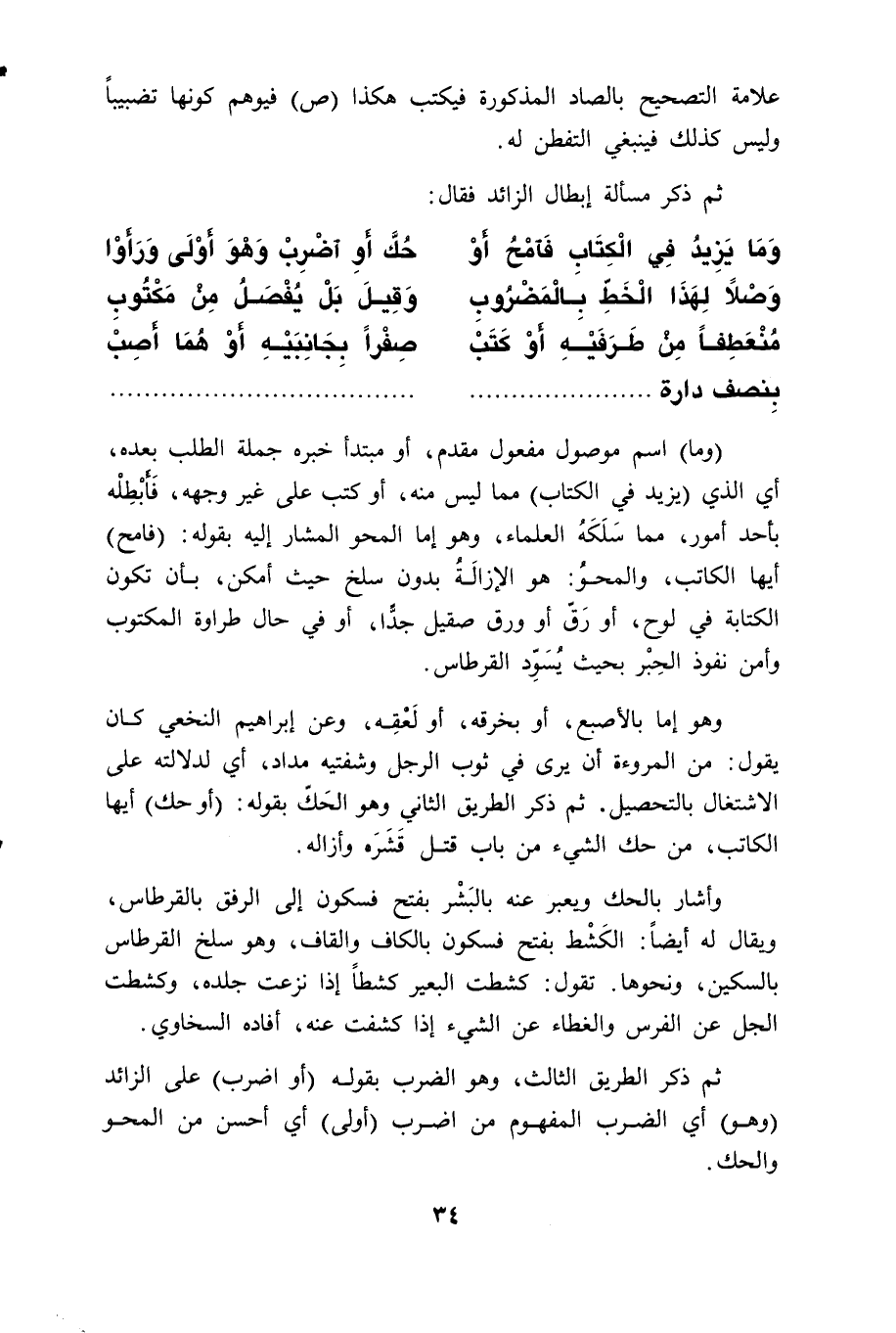 وهو إما بالأصبع، أو بخرقه، أو لَحْقِه، وعن إبراهيم النخعي كان يقول: من المروءة أن يرى في ثوب الرجل وشفتيه مداد، أي لدلالته على الاشتغال بالتحصيل. ثم ذكر الطريق الثاني وهو الحَكّ بقوله: (أو حك) أيها الكاتب، من حك الشيء من باب قتل قَشَرَه وأزاله.