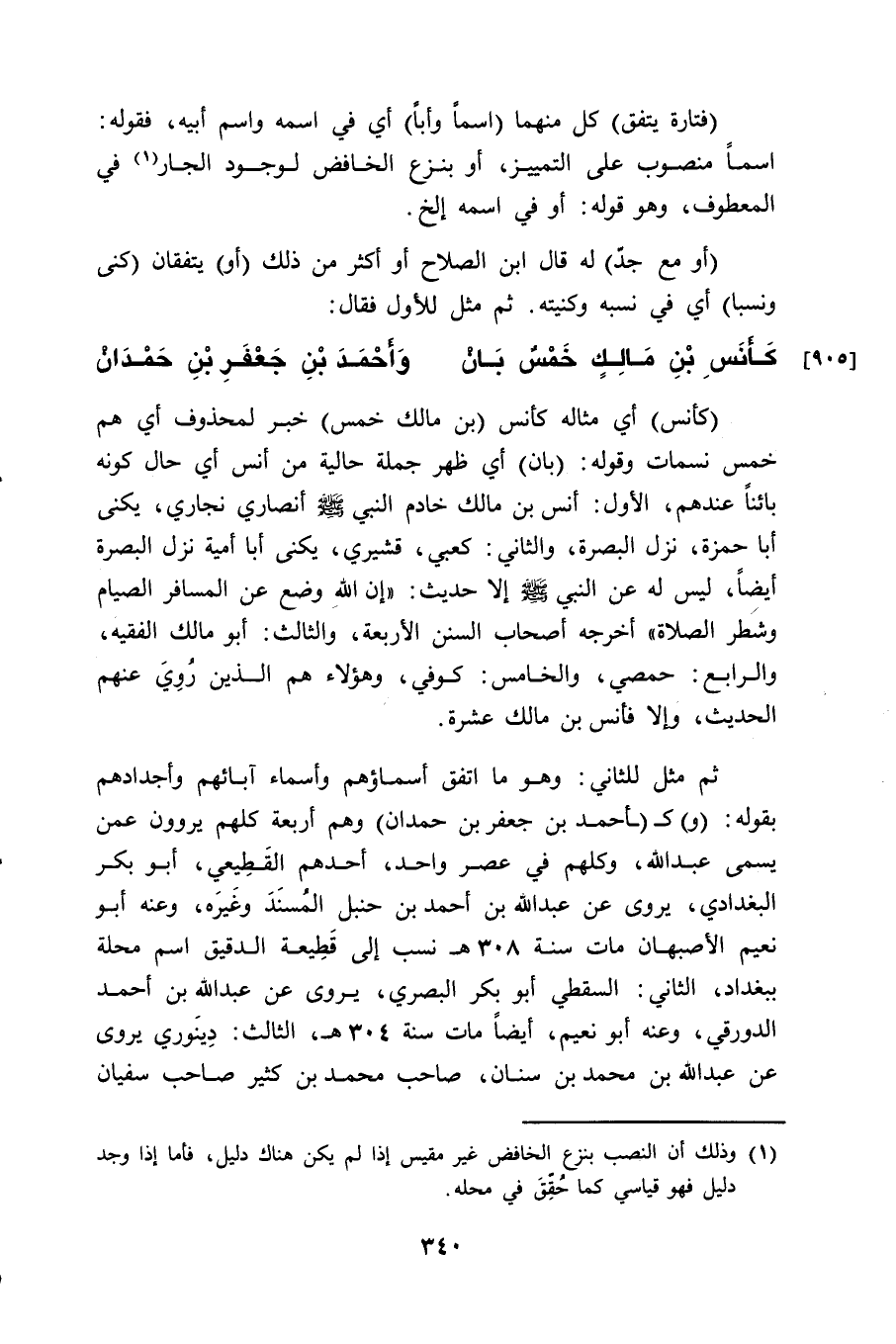 (كَأَنَسِ) أي مثاله كأنس (بن مالك خمس) خبر لمحذوف أي هم خمس نسمات وقوله: (بان) أي ظهر جملة حالية من أنس أي حال كونه بائناً عندهم، الأول: أنس بن مالك خادم النبي - صلى الله عليه وسلم - أنصاري نجاري، يكنى أبا حمزة، نزل البصرة، والثاني: كعبي، قشيري، يكنى أبا أمية نزل البصرة أيضاً، ليس له عن النبي - صلى الله عليه وسلم - إلا حديث: " إن اللهِ وضع عن المسافر الصيام وشَطر الصلاة " أخرجه أصحاب السنن الأربعة، والثالث: أبو مالك الفقيه، والرابع: حمصي، والخامس: كوفي، وهؤلاء هم الذين رُوِيَ عنهم الحديث، وإلا فأنس بن مالك عشرة.