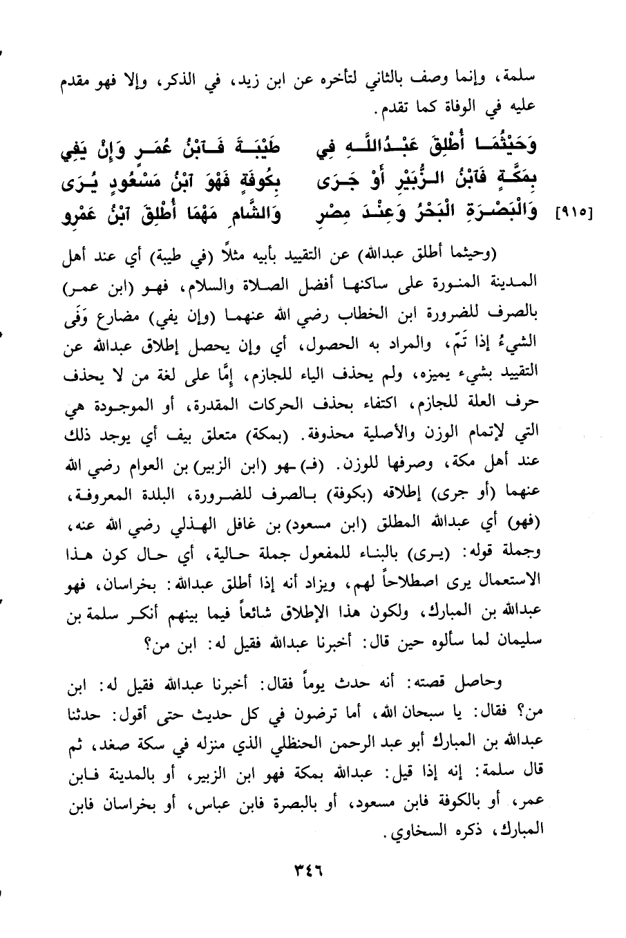 (وحيثما أطلق عبد الله) عن التقييد بأبيه مثلاً (في طيبة) أي عند أهل المدينة المنورة على ساكنها أفضل الصلاة والسلام، فهو (ابن عمر) بالصرف للضرورة ابن الخطاب - رضي الله عنهما - (وإن يفي) مضارع وَفَى الشيءُ إذا تَمَّ، والمراد به الحصول، أي وإن يحصل إطلاق عبد الله عن التقييد بشيء يميزه، ولم يحذف الياء للجازم، إِما على لغة من لا يحذف حرف العلة للجازم، اكتفاء بحذف الحركات المقدرة، أو الموجودة هي التي لإتمام الوزن والأصلية محذوفة. (بمكة) متعلق بيف أي يوجد ذلك عند أهل مكة، وصرفها للوزن. (فـ) ـهو (ابن الزبير) بن العوام - رضي الله عنهما - (أو جرى) إطلاقه (بكوفة) بالصرف للضرورة، البلدة المعروفة، (فهو) أي عبد الله المطلق (ابن مسعود) بن غافل الهذلي - رضي الله عنه -، وجملة قوله: (يرى) بالبناء للمفعول جملة حالية، أي حال كون هذا الاستعمال يرى اصطلاحاً لهم، ويزاد أنه إذا أطلق عبد الله: بخراسان، فهو عبد الله بن المبارك، ولكون هذا الإطلاق شائعاً فيما بينهم أنكر سلمة بن سليمان لما سألوه حين قال: أخبرنا عبد الله فقيل له: ابن من؟