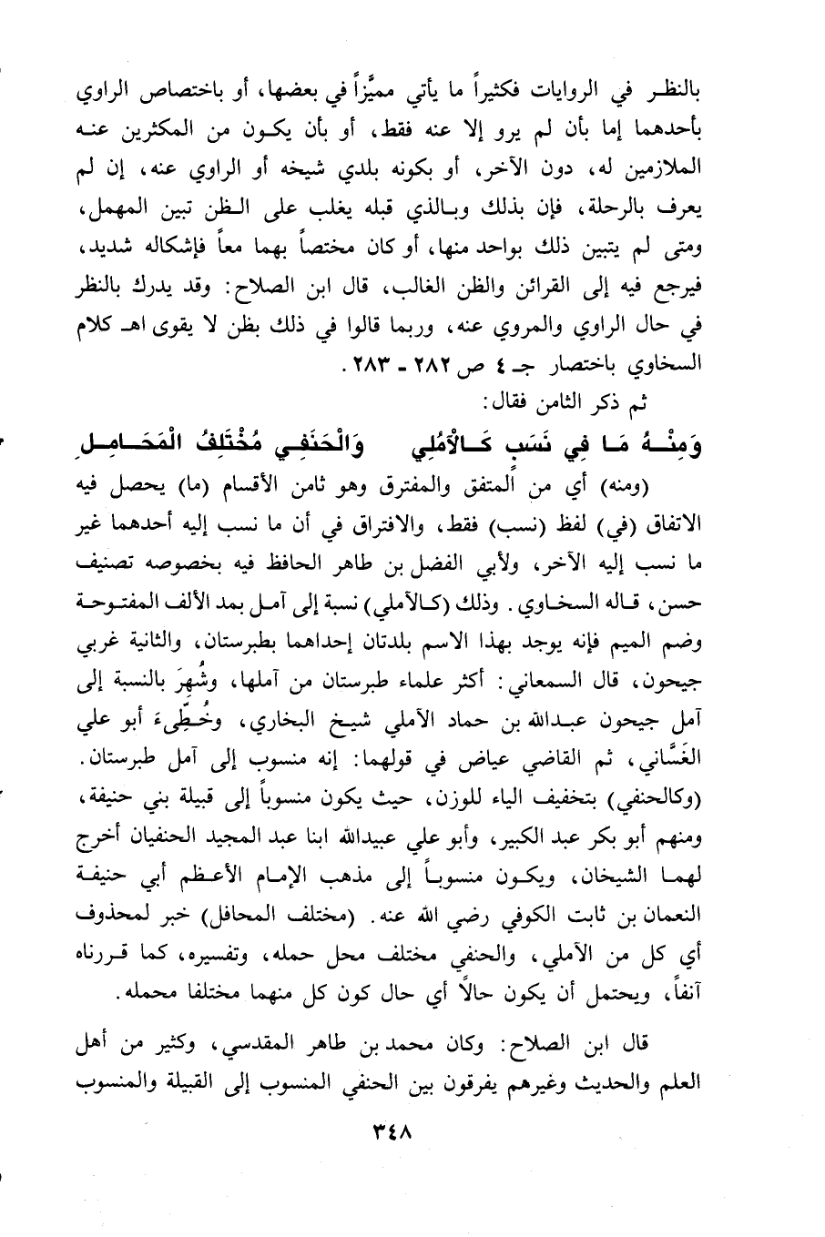 (ومنه) أي في المتفق والمفترق وهو ثامن الأقسام (ما) يحصل فيه الاتفاق (في) لفظ (نسب) فقط، والافتراق في أن ما نسب إليه أحدهما غير ما نسب إليه الآخر، ولأبي الفضل بن طاهر الحافظ فيه بخصوصه تصنيف حسن، قاله السخاوي. وذلك (كالآملي) نسبة إلى آمل بمد الألف المفتوحة وضم الميم فإنه يوجد بهذا الاسم بلدتان إحداهما بطبرستان، والثانية غربي جيحون، قال السمعاني: أكثر علماء طبرستان من آملها، وشُهِرَ بالنسبة إلى آمل جيحون عبد الله بن حماد الآملي شيخ البخاري، وخطِّئَ أبو علي الغَسَّاني، ثم القاضي عياض في قولهما: إنه منسوب إلى آمل طبرستان.