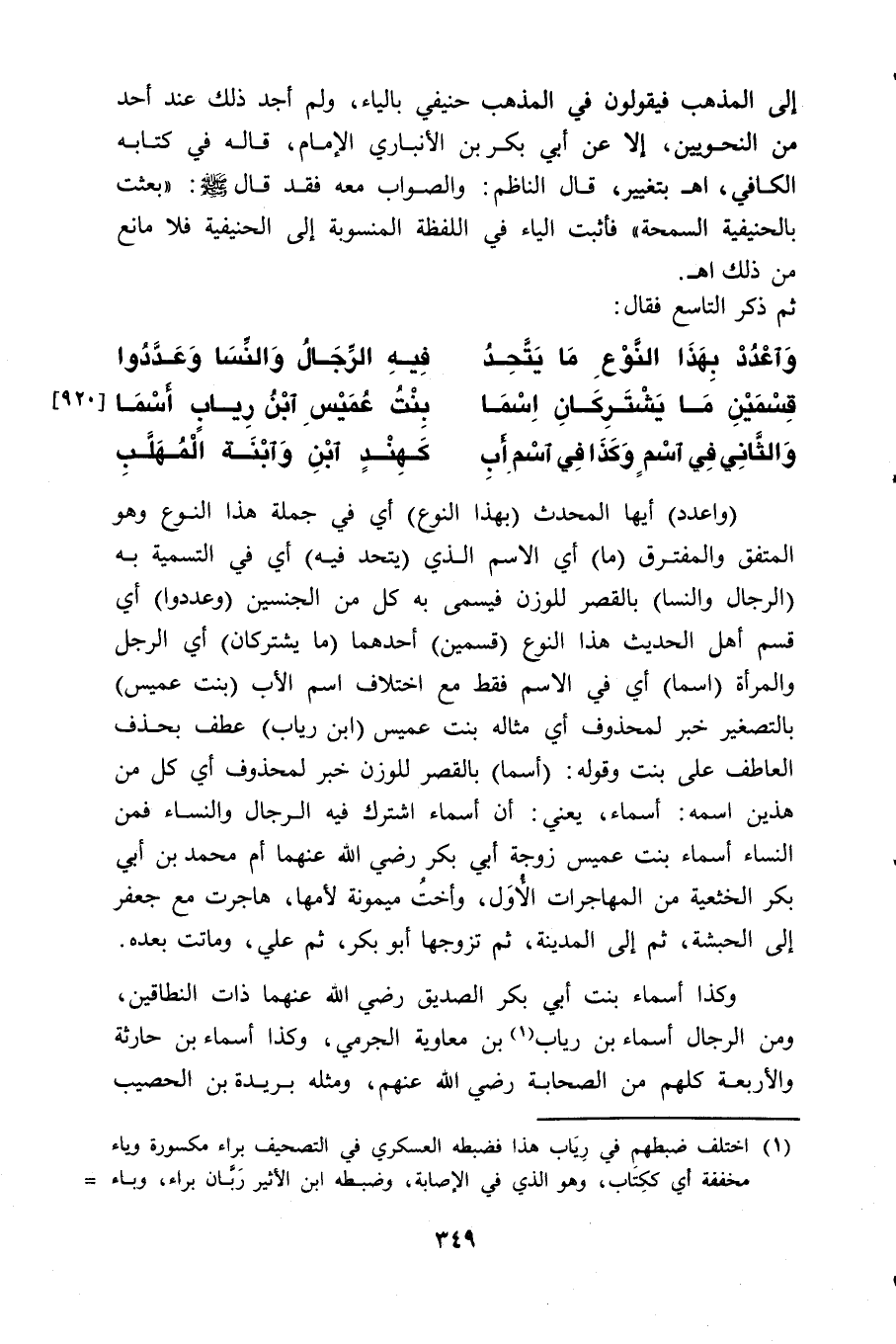 (واعدد) أيها المحدث (بهذا النوع) أي في جملة هذا النوع وهو المتفق والمفترق (ما) أي الاسم الذي (يتحد فيه) أي في التسمية به (الرجال والنسا) بالقصر للوزن فيسمى به كل من الجنسين (وعددوا) أي قسم أهل الحديث هذا النوع (قسمين) أحدهما (ما يشتركان) أي الرجل والمرأة (اسما) أي في الاسم فقط مع اختلاف اسم الأب (بنت عميس) بالتصغير خبر لمحذوف أي مثاله بنت عميس (ابن رياب) عطف بحذف العاطف على بنت وقوله: (أسما) بالقصر للوزن خبر لمحذوف أي كل من هذين اسمه: أسماء، يعني: أن أسماء اشترك فيه الرجال والنساء فمن النساء أسماء بنت عميس زوجة أبي بكر - رضي الله عنهما - أم محمد بن أبي بكر الخثعية من المهاجرات الأُوَل، وأختُ ميمونة لأمها، هاجرت مع جعفر إلى الحبشة، ثم إلى المدينة، ثم تزوجها أبو بكر، ثم علي، وماتت بعده.