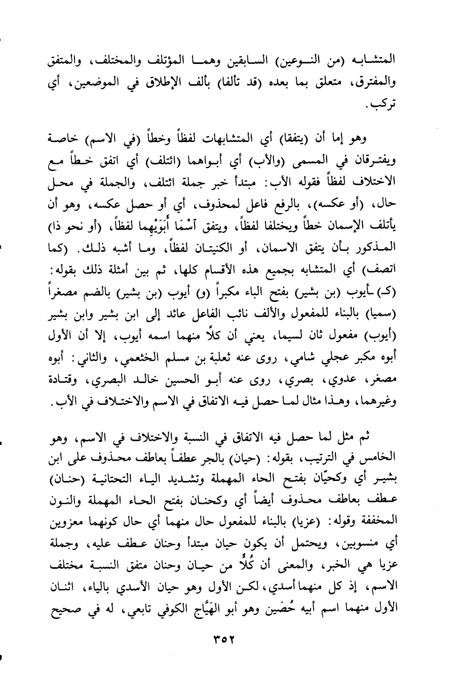 وهو إما أن (يتفقا) أي المتشابهات لفظاً وخطاً (في الاسم) خاصة ويفترقان في المسمى (والأب) أي أبواهما (ائتلف) أي اتفق خطاً مع الاختلاف لفظاً فقوله الأب: مبتدأ خبر جملة ائتلف، والجملة في محل حال، (أو عكسه)، بالرفع فاعل لمحذوف، أي أو حصل عكسه، وهو أن يأتلف الإسمان خطاً ويختلفا لفظاً، ويتفق اسْمَا أبَوَيْهِما لفظاً، (أو نحو ذا) المذكور بأن يتفق الاسمان، أو الكنيتان لفظاً، وما أشبه ذلك. (كما اتصف) أي المتشابه بجميع هذه الأقسام كلها، ثم بين أمثلة ذلك بقوله: (كـ) ـأيوب (بن بشير) بفتح الباء مكبراً (و) أيوب (بن بشير) بالضم مصغراً (سميا) بالبناء للمفعول والألف نائب الفاعل عائد إلى ابن بشير وابن بشير (أيوب) مفعول ثان لسيما، يعني أن كلًا منهما اسمه أيوب، إلا أن الأول أبوه مكبر عجلي شامي، روى عنه ثعلبة بن مسلم الخثعمي، والثاني: أبوه مصغر، عدوي، بصري، روى عنه أبو الحسين خالد البصري، وقتادة وغيرهما، وهذا مثال لما حصل فيه الاتفاق في الاسم والاختلاف في الأب.