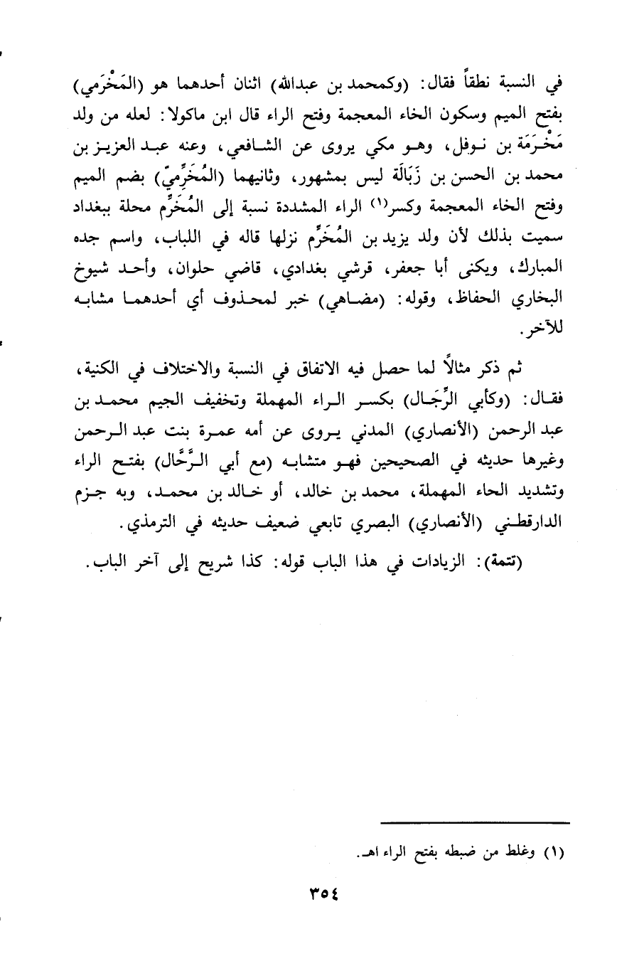 في النسبة نطقاً فقال: (وكمحمد بن عبد الله) اثنان أحدهما هو (المَخْرَمي) بفتح الميم وسكون الخاء المعجمة وفتح الراء قال ابن ماكولا: لعله من ولد مَخرَمَة بن نوفي، وهو مكي يروى عن الشافعي، وعنه عبد العزيز بن محمد بن الحسن بن زَبَالَة ليس بمشهور، وثانيهما (المُخَرِّميّ) بضم الميم وفتح الخاء المعجمة وكسر (¬1) الراء المشددة نسبة إلى المُخَرِّم محلة ببغداد سميت بذلك لأن ولد يزيد بن المُخَرم نزلها قاله في اللباب، واسم جده المبارك، ويكنى أبا جعفر، قرشي بغدادي، قاضي حلوان، وأحد شيوخ البخاري الحفاظ، وقوله: (مضاهي) خبر لمحذوف أي أحدهما مشابه للآخر.