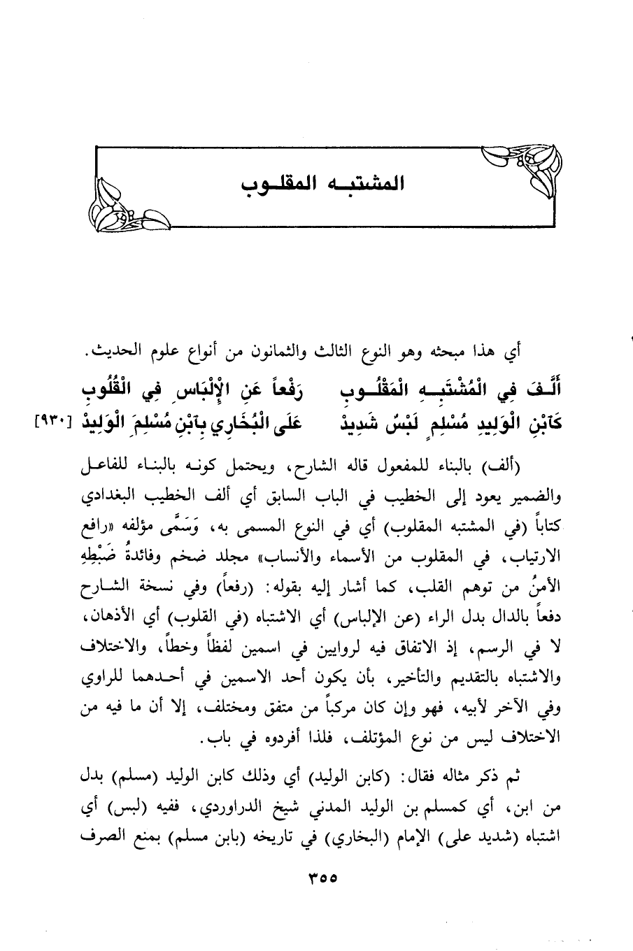 (ألف) بالبناء للمفعول قاله الشارح، ويحتمل كونه بالبناء للفاعل والضمير يعود إلى الخطيب في الباب السابق أي ألف الخطيب البغدادي كتاباً (في المشتبه المقلوب) أي في النوع المسمى به، وَسَمَّى مؤلفه " رافع الارتياب، في المقلوب من الأسماء والأنساب " مجلد ضخم وفائدةُ ضَبْطِهِ الأمنُ من توهم القلب، كما أشار إليه بقوله: (رفعاً) وفي نسخة الشارح دفعاً بالدال بدل الراء (عن الإلباس) أي الاشتباه (في القلوب) أي الأذهان، لا في الرسم، إذ الاتفاق فيه لروايين في اسمين لفظاً وخطاً، والاختلاف والاشتباه بالتقديم والتأخير، بأن يكون أحد الاسمين في أحدهما للراوي وفي الآخر لأبيه، فهو وإن كان مركباً من متفق ومختلف، إلا أن ما فيه من الاختلاف ليس من نوع المؤتلف، فلذا أفردوه في باب.