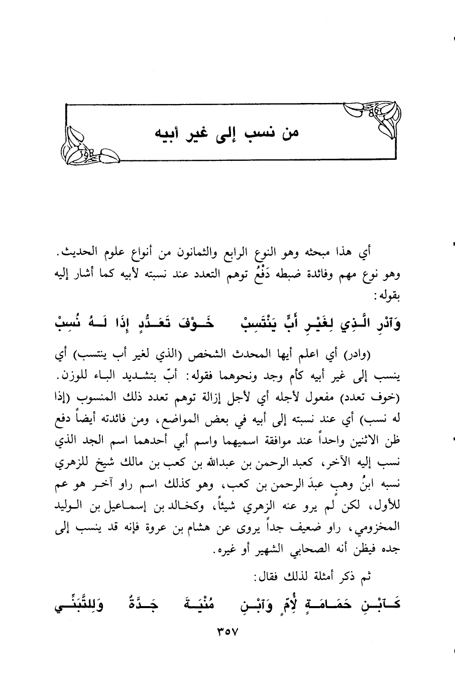 (وادر) أي اعلم أيها المحدث الشخص (الذي لغير أب ينتسب) أي ينسب إلى غير أبيه كأم وجد ونحوهما فقوله: أبّ بتشديد الباء للوزن.