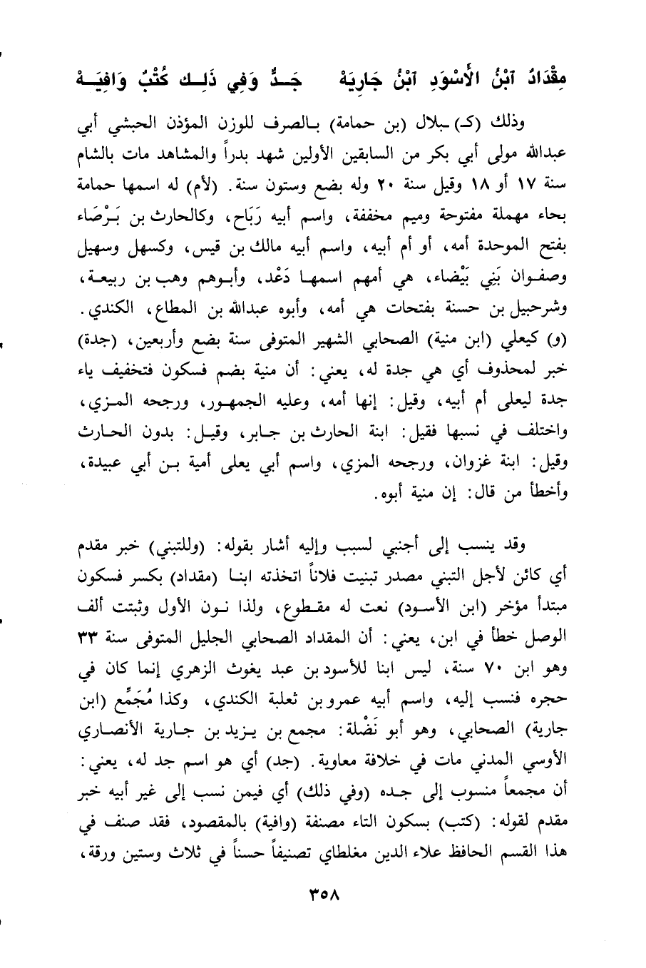 وذلك (كـ) ـبلال (بن حمامة) بالصرف للوزن المؤذن الحبشي أبي عبد الله مولى أبي بكر من السابقين الأولين شهد بدراً والمشاهد مات بالشام سنة 17 أو 18 وقيل سنة 20 وله بضع وستون سنة. (لأم) له اسمها حمامة بحاء مهملة مفتوحة وميم مخففة، واسم أبيه رَبَاح، وكالحارث بن بَرْصَاء بفتح الموحدة أمه، أو أم أبيه، واسم أبيه مالك بن قيس، وكسهل وسهيل وصفوان بَنِي بَيْضاء، هي أمهم اسمها دَعْد، وأبوهم وهب بن ربيعة، وشرحبيل بن حسنة بفتحات هي أمه، وأبوه عبد الله بن المطاع، الكندي.
