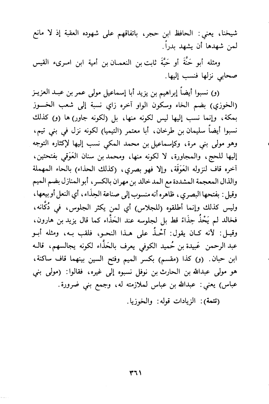 (و) نسبوا أيضاً إبراهيم بن يزيد أبا إسماعيل مولى عمر بن عبد العزيز (الخوزي) بضم الخاء وسكون الواو آخره زاي نسبة إلى شعب الخوز بمكة، وإنما نسب إليها ليس لكونه منها، بل (لكونه جاور) ها (و) كذلك نسبوا أيضاً سليمان بن طرخان، أبا معتمر (التيميا) لكونه نزل في بني تيم، وهو مولى بني مرة، وكإسماعيل بن محمد المكي نسب إليها لإكثاره التوجه إليها للحج، والمجاورة، لا لكونه منها، ومحمد بن سنان العَوَقي بفتحتين، آخره قاف لنزوله العَوَقَة، وإلا فهو بصري، (كذلك الحذاء) بالحاء المهملة والذال المعجمة المشددة مع المد خالد بن مهران بالكسر، أبو المنازل بضم الميم وقيل: بفتحها البصري، ظاهره أنه منسوب إلى صناعة الحِذَاء، أي النعل أو بيعها، وليس كذلك وإنما أطلقوه (للجلاس) أي لمن يكثر الجلوس، في دُكَّانه، فخالد لم يَحْذُ حِذَاءً قط بل لجلوسه عند الحَذَّاء كما قال يزيد بن هارون، وقيل: لأنه كان يقول: آحْذُ على هذا النحو، فلقب به، ومثله أبو عبد الرحمن عَبيدة بن حُميد الكوفي يعرف بالحَذَّاء لكونه يجالسهم، قاله ابن حبان. (و) كذا (مقسم) بكسر الميم وفتح السين بينهما قاف ساكنة، هو مولى عبد الله بن الحارث بن نوفل نسبوه إلى غيره، فقالوا: (مولى بني عباس) يعني: عبد الله بن عباس لملازمته له، وجمع بني ضرورة.