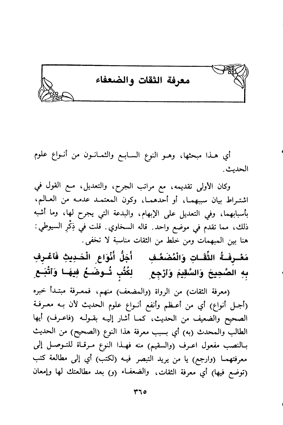 (معرفة الثقات) من الرواة (والمضعف) منهم، فمعرفة مبتدأ خبره (أجل أنواع) أي من أعظم وأنفع أنواع علوم الحديث لأن به معرفة الصَّحِيح والضَّعِيف من الحديث، كما أشار إليه بقوله (فاعرف) أيها الطالب والمحدث (به) أي بسبب معرفة هذا النوع (الصَّحِيح) من الحديث بالنصب مفعول اعرف (والسقيم) منه فهذا النوع مرقاة للتوصل إلى معرفتهما (وارجع) يا من يريد التبصر فيه (لكتب) أي إلى مطالعة كتب (توضع فيها) أي معرفة الثقات، والضعفاء (و) بعد مطالعتك لها وإمعان